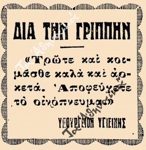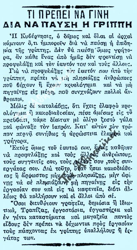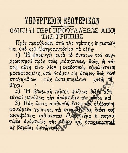 «Γαργαρισμούς δι’ οξυγονούχου ύδατος και τας αντισηπτικάς εισπνοάς. Πρέπει να αποφεύγουμε τας ψύξεις, την υπερκόπωση και συγκεντρώσεις παντός είδους και να τηρήται η καθαριότης των εσωρούχων και των χεριών»,