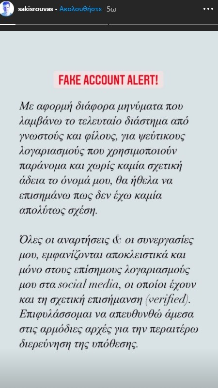Όλες οι αναρτήσεις και οι συνεργασίες μου, εμφανίζονται αποκλειστικά και μόνο στους επίσημους λογαριασμούς μου στα social media, οι οποίοι έχουν και τη σχετική επισήμανση (verified). Επιφυλάσσομαι να απευθυνθώ άμεσα στις αρμόδιες αρχές για την περαιτέρω διερεύνηση της υπόθεσης», έγραψε χαρακτηριστικά ο Σάκης Ρουβάς.