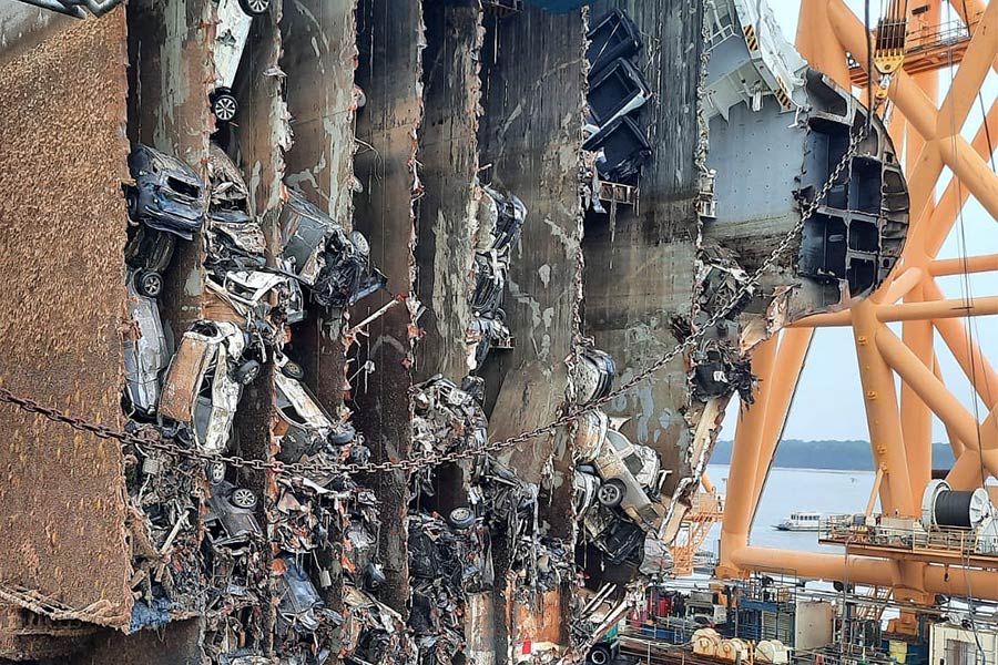 Το πλοίο MV Golden Ray θα κοπεί σε οκτώ κομμάτια, το καθένα από τα οποία ζυγίζει μεταξύ 2.700 έως 4.100 τόνους και μεταφερθεί σε μια πλωτή πλατφόρμα για να κοπεί σε μικρότερα κομμάτια.