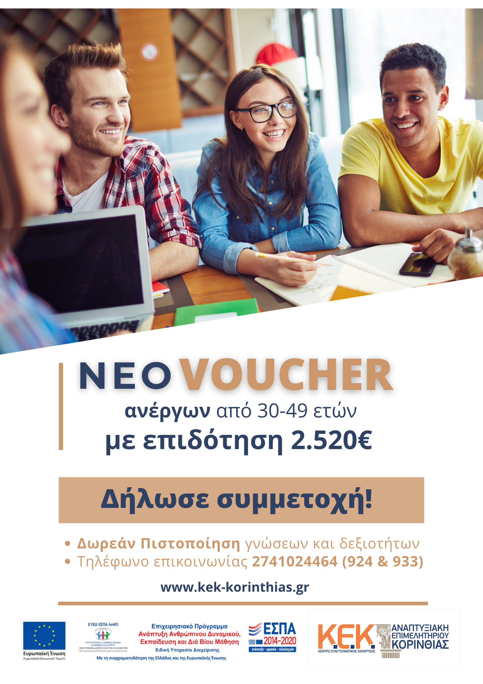 Κάνε την αίτηση σου σήμερα και διεκδίκησε μία θέση στο νέο πρόγραμμα voucher που αφορά 10.000 ανέργους ηλικίας 30-49, με Εκπαιδευτικό Επίδομα 2.520€ και διάρκεια 580 ωρών.