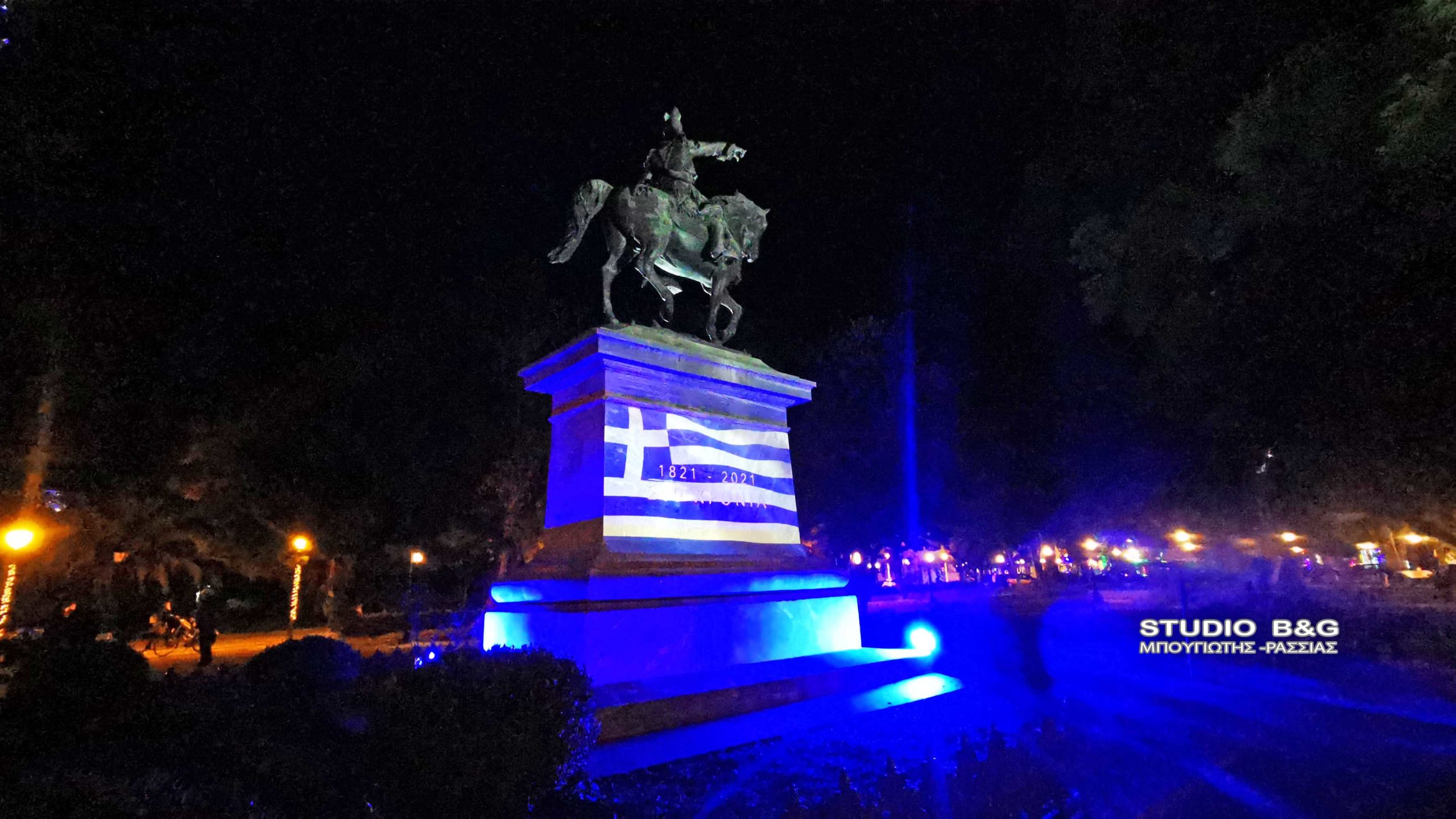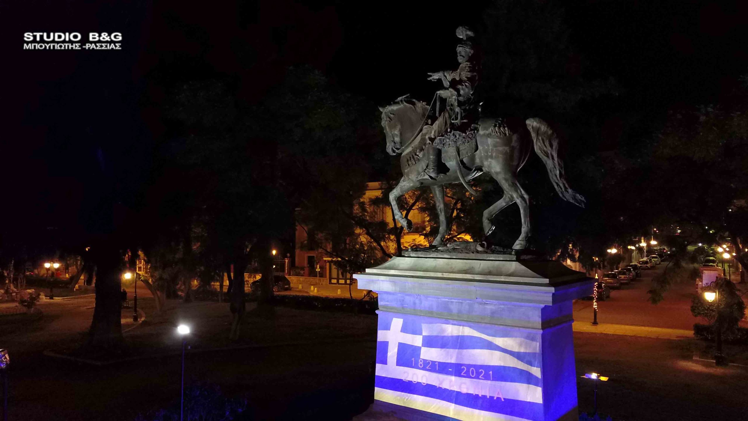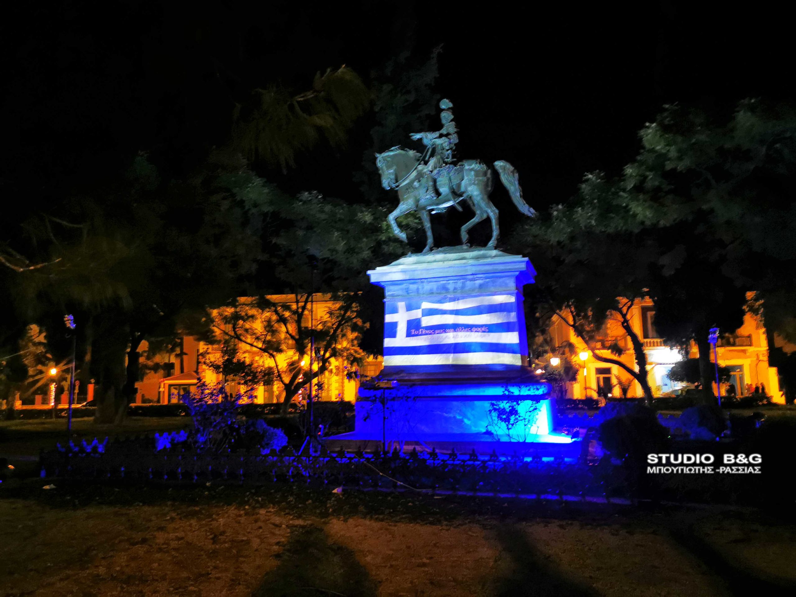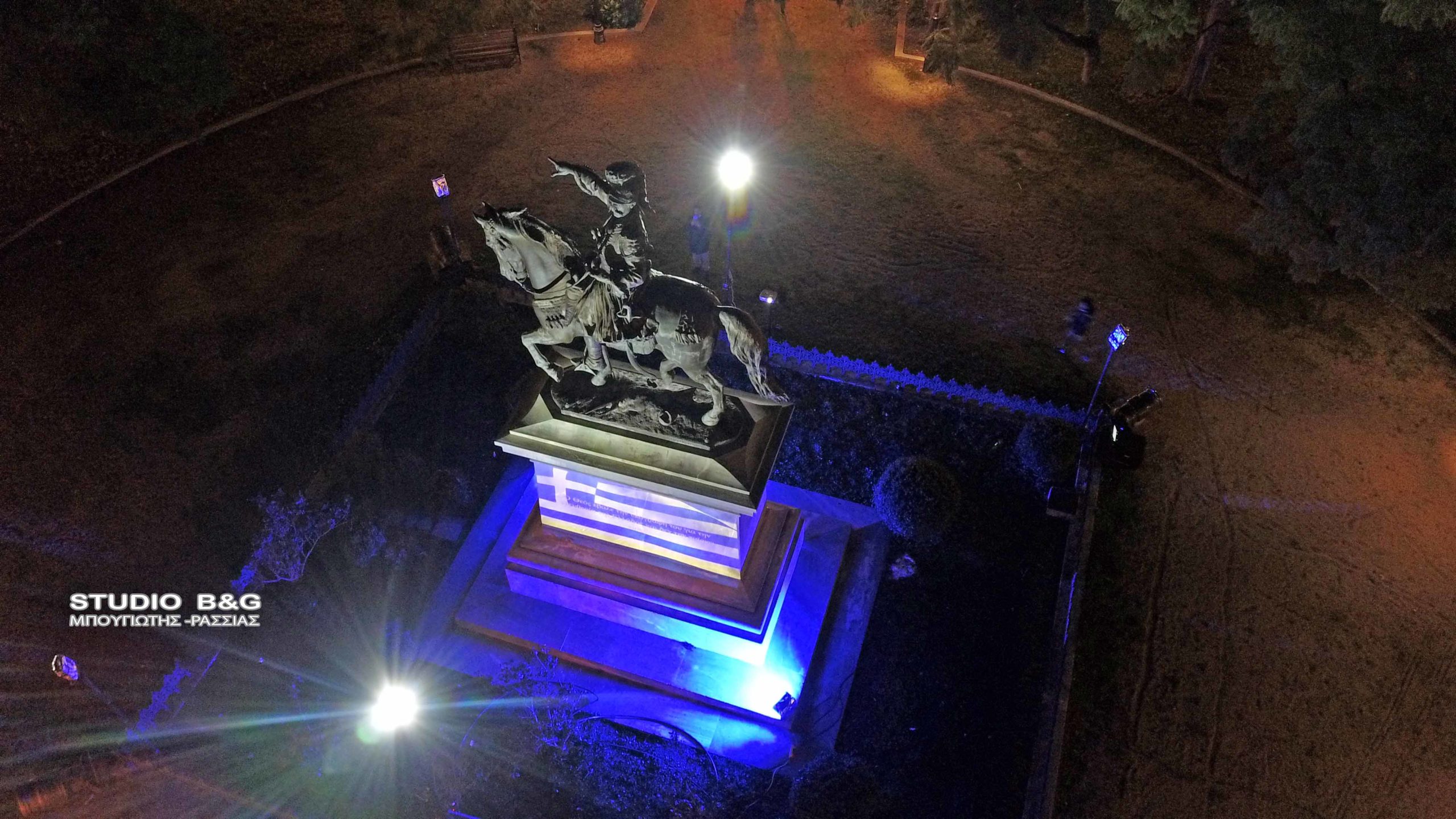Με την Ελληνική Σημαία φωτίστηκε το άγαλμα του Κολοκοτρώνη στο ομώνυμο πάρκο του Δήμου Ναυπλίου στα πλαίσια της έναρξης των εορτασμών για τα διακόσια χρόνια από την Εθνική παλιγγενεσία , Παρασκευή 1 Ιανουαρίου 2020.