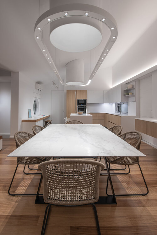 Το ξεχωριστό κίτρινο χρώμα της πόρτας – μια παιχνιδιάρικη επιλογή που αποσκοπεί να πυροδοτήσει τη φαντασία των παιδιών – βλέπει την εκπληκτική θέα στη θάλασσα και στο μυθικό βουνό του Παρνασσού που υψώνεται πάνω από τον Κόλπο της Κορίνθου. Όλα αυτά δημιουργούν ένα μοναδικό σκηνικό για την κουζίνα ανοιχτού χώρου και την τραπεζαρία από υαλοπίνακα από το δάπεδο μέχρι την οροφή, που βρίσκονται πίσω από την πόρτα.