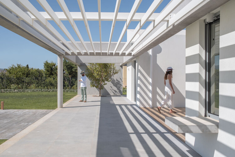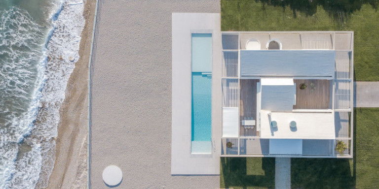 Αντικατοπτρίζοντας την ομαλότητα του γύρω εδάφους, το Beach House Neratza εκτείνεται κατά μήκος της παραλίας, με κυρίαρχα στοιχεία την τσιμεντένια πέργκολα και μια επιμήκη πισίνα που οριοθετεί διακριτικά τα όρια μεταξύ του σπιτιού και της παραλίας.