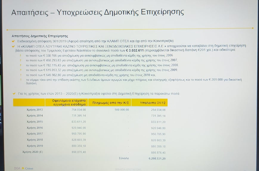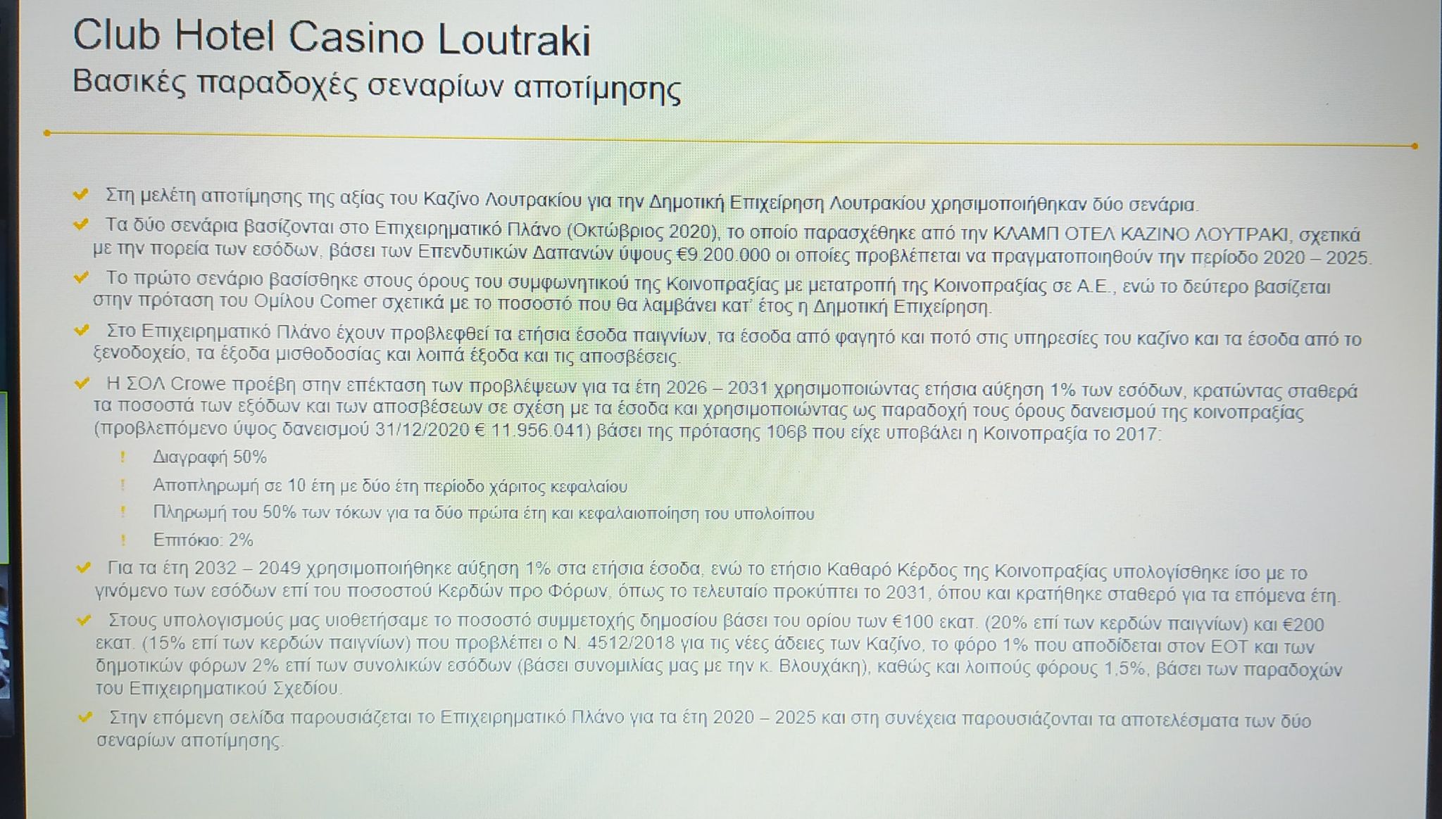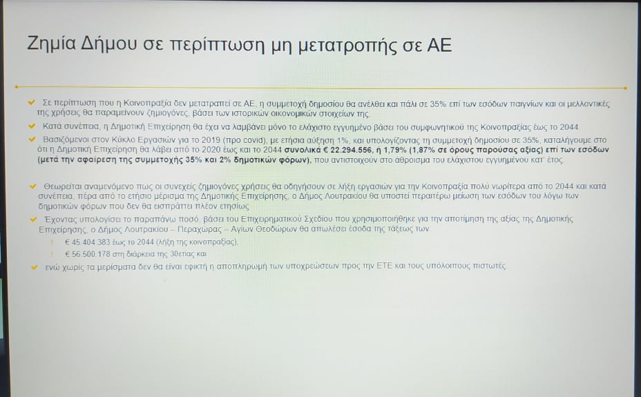 Στη χθεσινή συνεδρίαση του δημοτικού συμβουλίου στο Λουτράκι, συζητήθηκε η μελέτη της οικονομοτεχνικής εταιρείας Ορκωτών Λογιστών με την επωνυμία ΣΟΛ CROWE για τη μετατροπή της Κοινοπραξίας σε Ανώνυμη Εταιρεία.