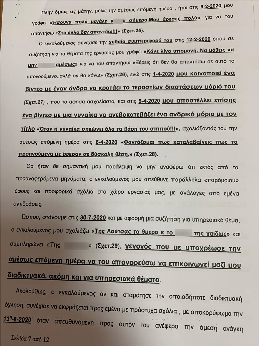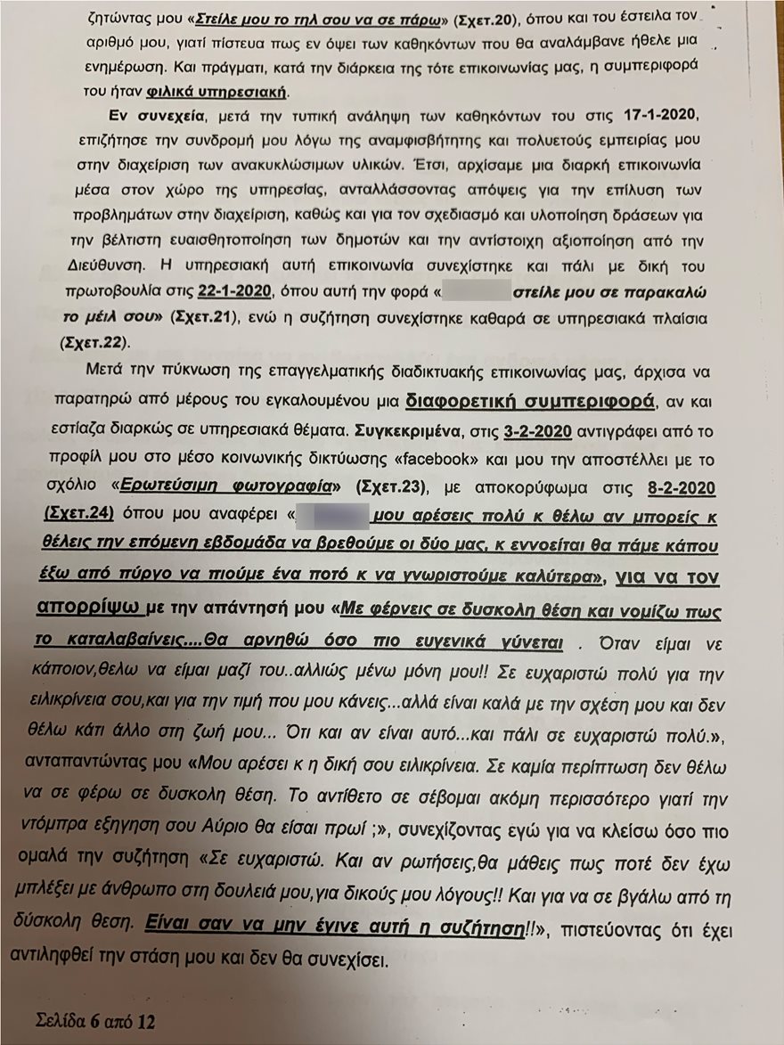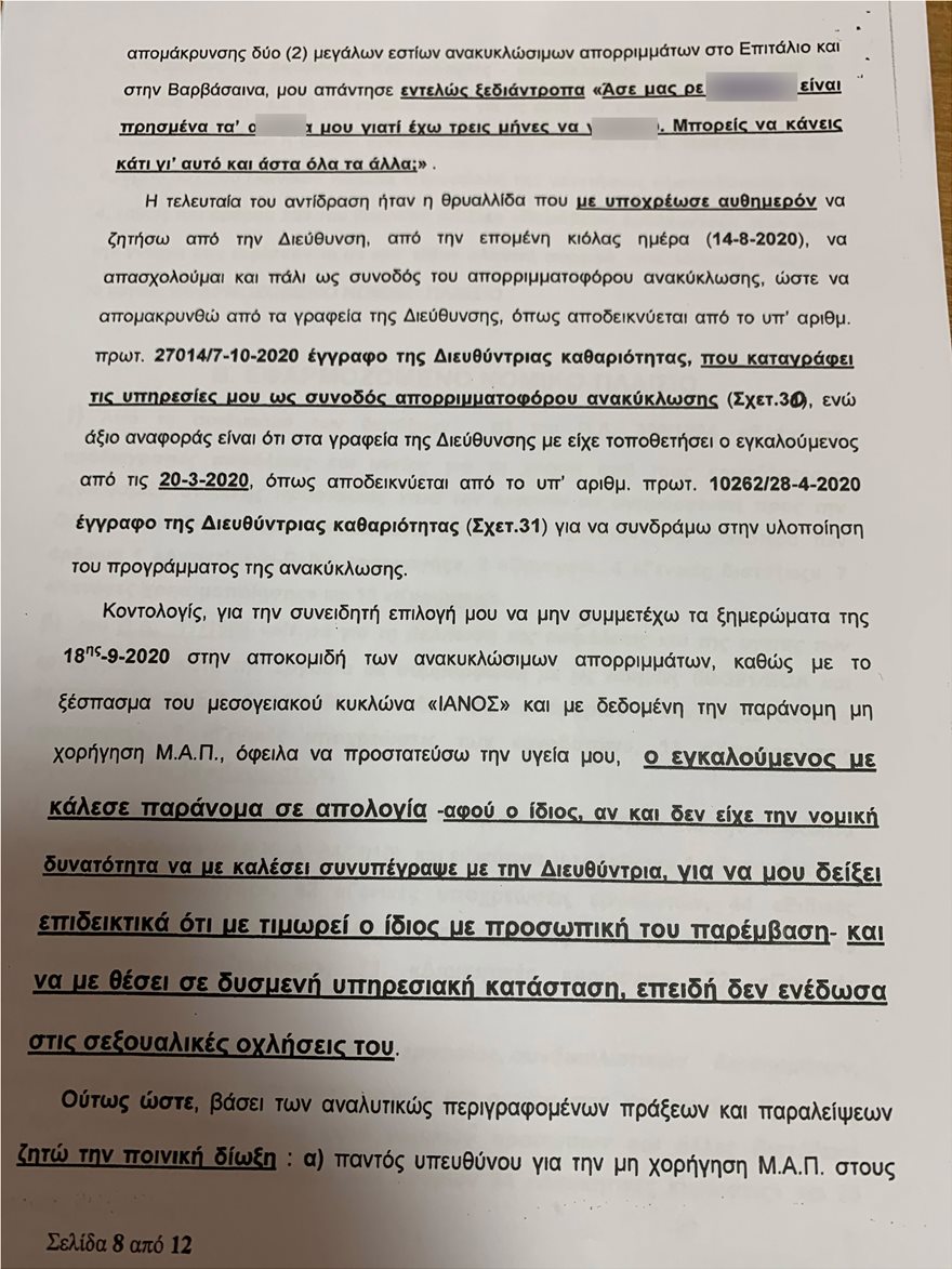Η καταγγέλλουσα αναφέρει μάλιστα ότι επειδή ακριβώς δεν ενέδωσε στις σεξουαλικές απαιτήσεις του εν λόγω δημοτικού παράγοντα, υπήρξε από μέρους του εκδικητική συμπεριφορά με την κλήση της σε απολογία για υπηρεσιακά θέματα.