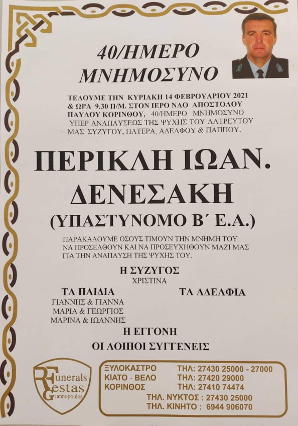 Στις 09:30 το πρωί της Κυριακής 14 Φεβρουαρίου 2021 θα τελεστεί το 40ήμερο μνημόσυνο υπέρ αναπαύσεως της ψυχής του αστυνομικού Περικλή Ιωαν. Δενεσάκη.