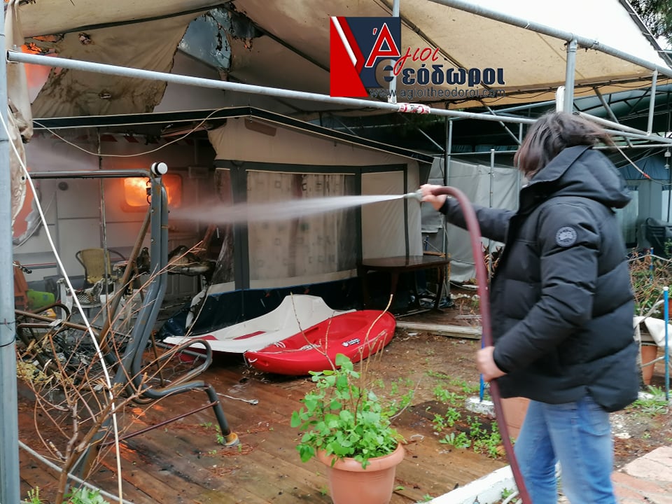 Σύμφωνα με πληροφορίες έχουν καεί έως τώρα, 3 τροχόσπιτα και αρκετά πεύκα.