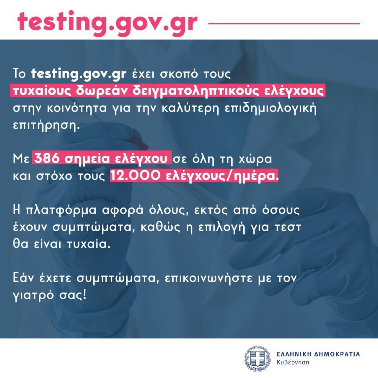 Με μια διαδικτυακή αίτηση και μέσω της ειδικής πλατφόρμας, οι πολίτες μπορούν να εκφράσουν το ενδιαφέρον τους για δωρεάν τεστ κορωνοϊού. Όσοι επιλεγούν, θα έχουν τη δυνατότητα να κάνουν το τεστ στα 386 σταθερά σημεία ελέγχου που έχουν καθοριστεί.