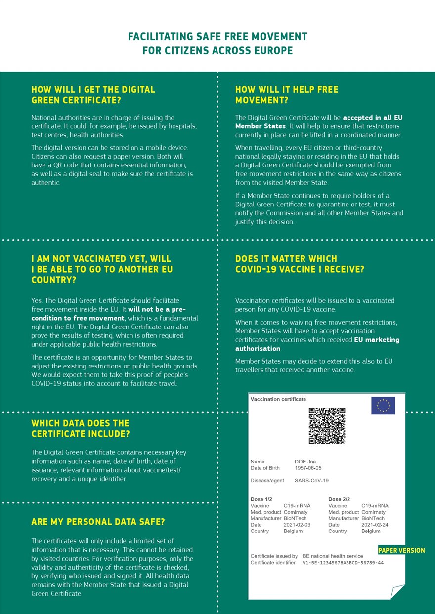 Ο Επίτροπος Δικαιοσύνης Ντιντιέ Ρέιντερς υπογράμμισε ότι το συγκεκριμένο πιστοποιητικό θα αποτελέσει ένα εργαλείο για τα κράτη μέλη και θα μπορεί να χρησιμοποιείται ακόμα και για ταξίδια με αυτοκίνητο από ένα κράτος μέλος σε ένα άλλο. Σύμφωνα με τον ιδιον, το πιστοποιητικό θα είναι προσωρινό και δεν θα χρειάζεται πλέον όταν ο Παγκόσμιος Οργανισμός Υγείας ανακοινώσει επισήμως το τέλος της πανδημίας.