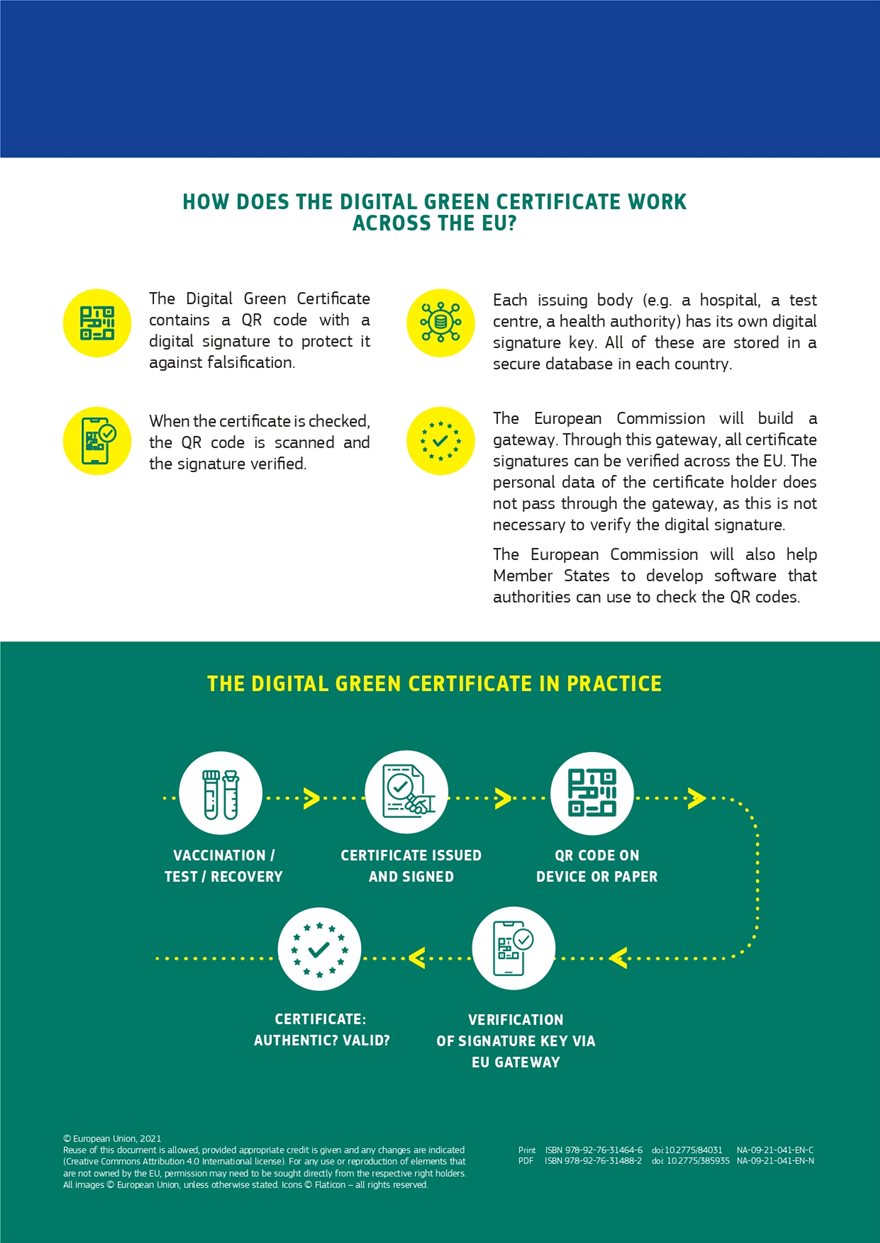 Το ψηφιακό πράσινο πιστοποιητικό θα καλύπτει τρία είδη πιστοποιητικών — πιστοποιητικά εμβολιασμού, πιστοποιητικά εξέτασης (δοκιμασία NAAT/RT-PCR ή ταχεία δοκιμασία αντιγόνου) και πιστοποιητικά για άτομα που έχουν αναρρώσει από την COVID-19.
