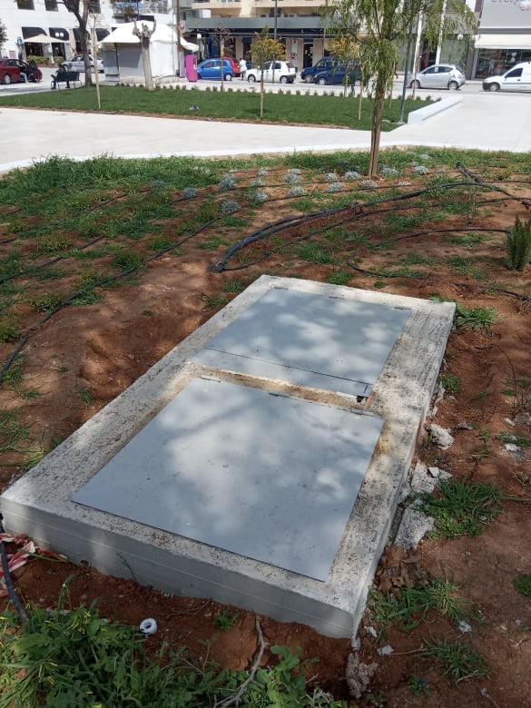 ► Το πηγάδι με το νερό άρδευσης σχεδόν στα βόρεια της πλατείας (όπου ήταν το αγαλματίδιο φιλοτεχνίας και δωρεάς Μάρτη) έχει σκεπαστεί στις δύο πλευρές του με ελαστική λαμαρίνα, χωρίς να ασφαλίζεται με κλειδιά. Κίνδυνος για τα παιδιά. Άμεση αντικατάσταση και ασφάλιση.