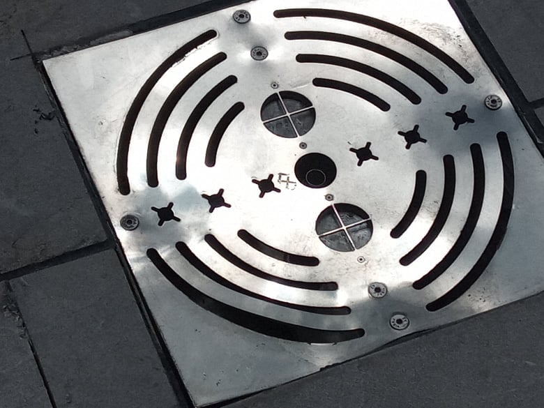 ► Οι σχάρες του σιντριβανιού ελάχιστης ανθεκτικότητας. Ήδη έχουν καταστραφεί με οχήματα που διήλθαν από το χώρο.