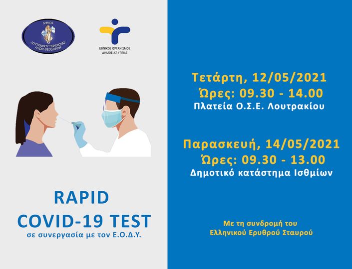 🔹 την Παρασκευή 14 Μαΐου, στο Δημοτικό Κατάστημα Ισθμίων και θα διενεργούν rapid test από τις 09:30 π.μ. έως τις 13:00 μ.μ.