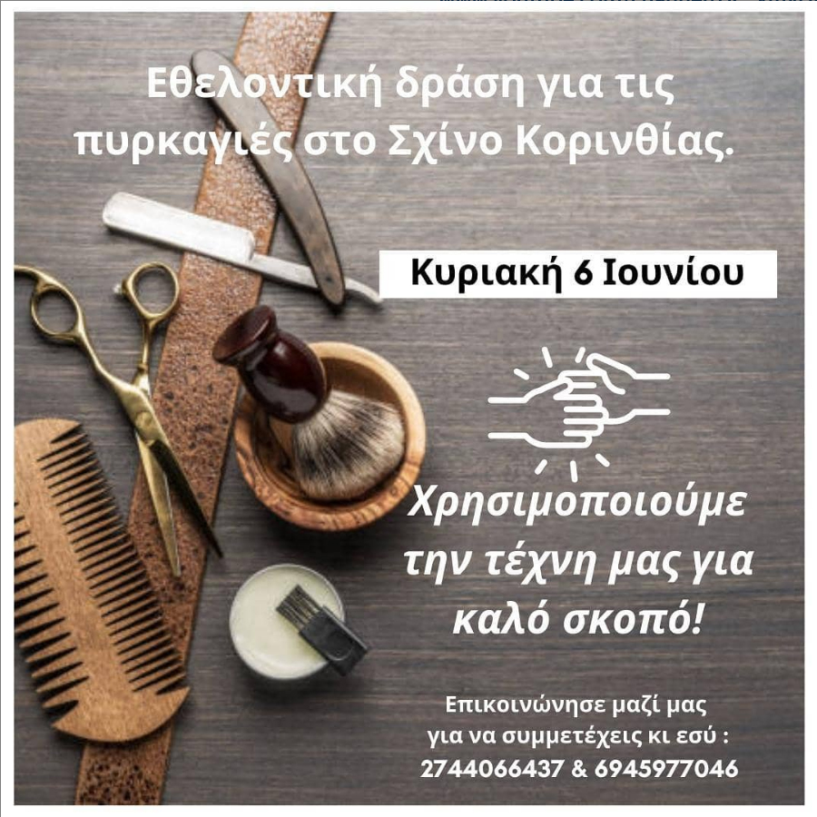 Ό Κωνσταντίνος Κουτούπης , κάτοχος του ρεκόρ World Guinness Record στο πιο γρήγορο κούρεμα, σε συνεργασία με την εταιρεία Marras Hair και τον Εξωραϊστικό και Πολιτιστικό Σύλλογο Σχίνου “Τα Γεράνεια” καλούν όλους τους κομμωτές/τριες και barber να λάβουν μέρος στην εθελοντική δράση για την ενίσχυση των πυρόπληκτων και των ζώων πού υπέστησαν ζημιές από την φωτιά στον Σχίνο-Αλεποχώρι.