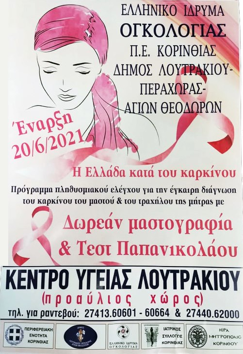 Με ιδιαίτερη χαρά σας πληροφορούμε, ότι στο πλαίσιο του προγράμματος «Η ΕΛΛΑΔΑ ΚΑΤΑ ΤΟΥ ΚΑΡΚΙΝΟΥ», το Ελληνικό Ίδρυμα Ογκολογίας, μετά από αίτημα του Δήμου Λουτρακίου – Περαχώρας – Αγίων Θεοδώρων, το οποίο έγινε αποδεκτό, και σε συνεργασία με την Περιφερειακή Ενότητα Κορινθίας της Περιφέρεια Πελοποννήσου – Peloponnese Region, ξεκινά πρόγραμμα πληθυσμιακού ελέγχου για την πρόληψη και έγκαιρη διάγνωση του καρκίνου του μαστού και τραχήλου της μήτρας, στις γυναίκες που κατοικούν μόνιμα στον Δήμο, με ΔΩΡΕΑΝ Μαστογραφία & Τεστ Παπανικολάου.