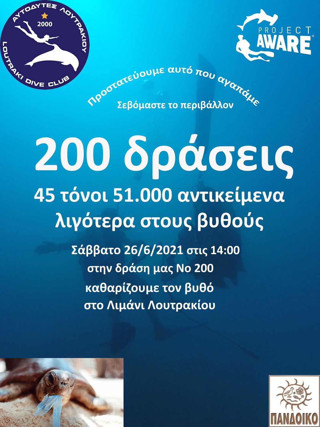 Ο Όμιλος Αυτοδυτών Λουτρακίου σας προσκαλεί να συμμετάσχετε στην 200η δράση τους για τον καθαρισμό του βυθού. Αυτήν την φορά έχουν σκοπό να καθαρίσουν το λιμάνι Λουτρακίου. Η δράση θα πραγματοποιηθεί το Σάββατο 26 Ιουνίου στις 14:00 και θα έχει διάρκεια 3 ώρες.