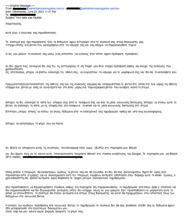 Στη Διεύθυνση Δίωξης Ηλεκτρονικού Εγκλήματος καταγγέλλονται το τελευταίο διάστημα περιπτώσεις διεθνούς απάτης γνωστής ως «απάτη μέσω σεξουαλικής εκβίασης – “sextortionscam”» που εκδηλώνεται με μαζική αποστολή μηνυμάτων ηλεκτρονικού ταχυδρομείου σε διάφορους αποδέκτες, ανεξαρτήτως φύλου και ηλικίας, με σκοπό να τους φοβίσει και στη συνέχεια να τους αποσπάσει χρήματα. Στα μηνύματα αυτά εμπεριέχεται κείμενο στα ελληνικά με θέμα: « Your data was hacked » ή «Open and read this letter».