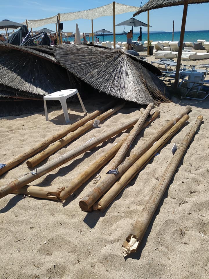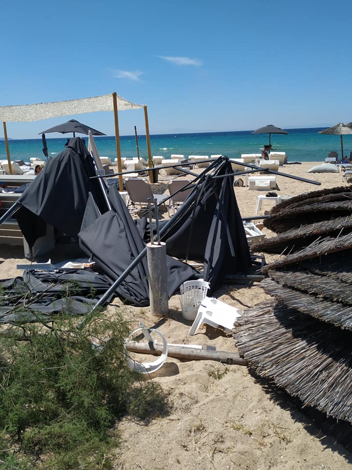 Από τον ανεμοστρόβιλο προκλήθηκαν υλικές ζημιές σε κατασκευές και beach bars στην περιοχή του ναυαγοσώστη αφού ξηλώθηκαν ξύλινες κατασκευές, ομπρέλες, ξαπλώστρες και πέργκολες.