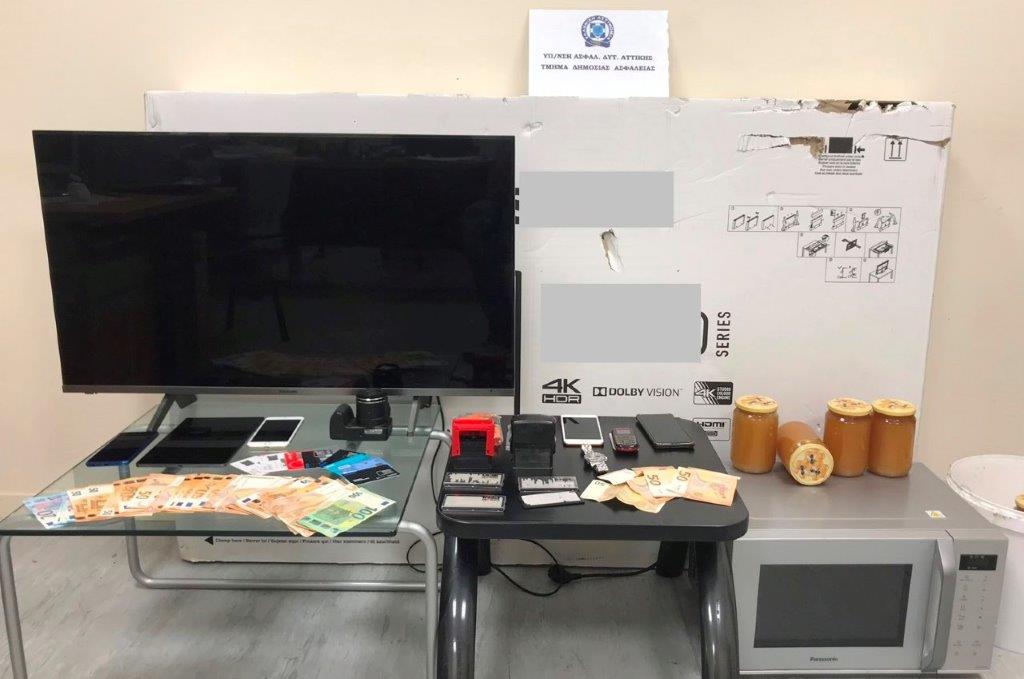 - Κατασχέθηκαν μεταξύ άλλων το χρηματικό ποσό των -2.250- ευρώ, Ι.Χ. Φορτηγό, -2- Ι.Χ.Ε. αυτοκίνητα, -31- κινητά τηλέφωνα, τηλεοράσεις, tablet , φωτογραφική μηχανή, φυσίγγια, πλήθος εγγράφων, τραπεζικών καρτών και εμπορευμάτων