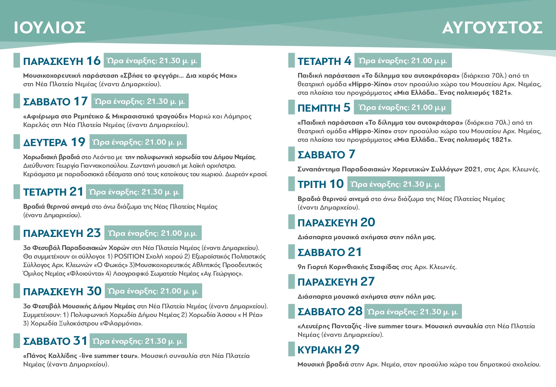 Ο Δήμος Νεμέας ανακοίνωσε το πλήρες πρόγραμμα των καλοκαιρινών του εκδηλώσεων που διοργανώνει από 16 Ιουλίου έως και 29 Αυγούστου 2021.