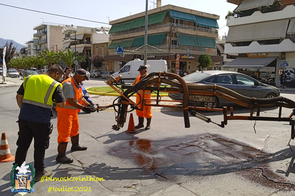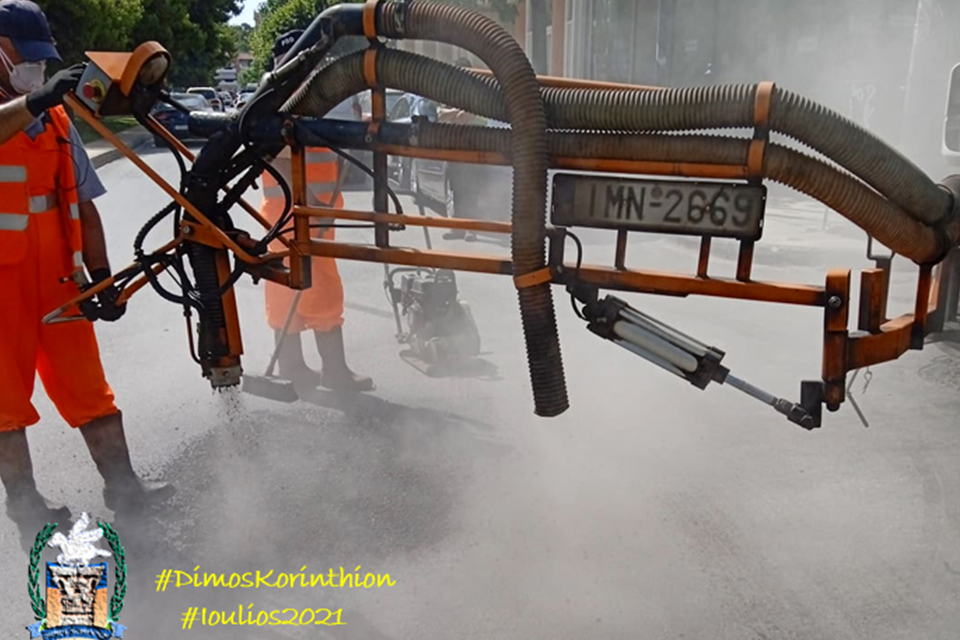 Με την χρήση εξειδικευμένου μηχανήματος προχωρά ο δήμος Κορινθίων στην αποκατάσταση των βλαβών των οδοστρωμάτων, όπου αυτές καταγράφονται.
