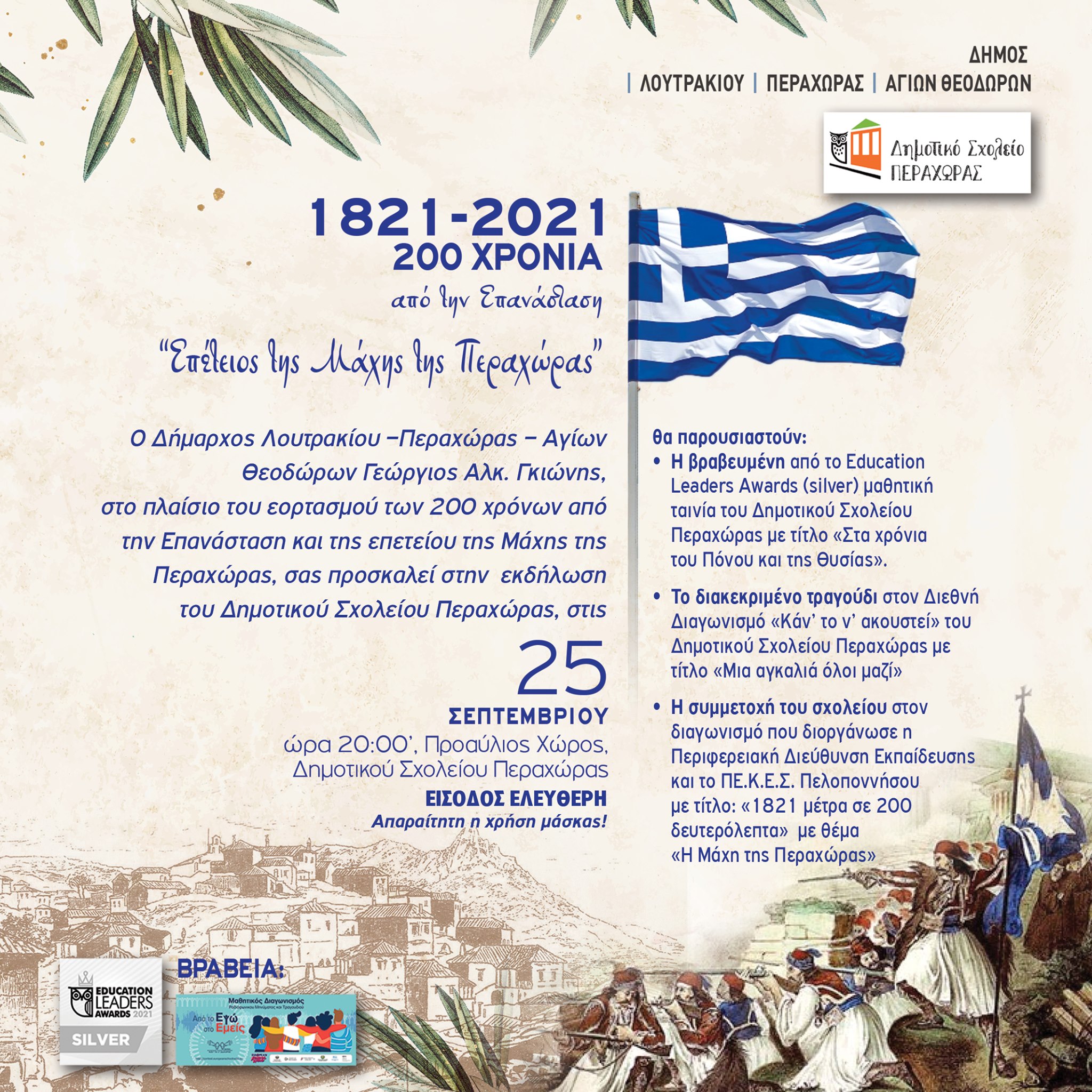Στο πλαίσιο του εθνικού εορτασμού των 200 χρόνων από την έναρξη της Επανάστασης του 1821 και των επετειακών εορτασμών της ένδοξης Μάχης της Περαχώρας, ο Δήμος Λουτρακίου – Περαχώρας σας προσκαλεί στις εκδηλώσεις που θα πραγματοποιηθούν σήμερα, Σάββατο 25 Σεπτεμβρίου στον ηρωικό και ευλογημένο τόπο της Περαχώρας.