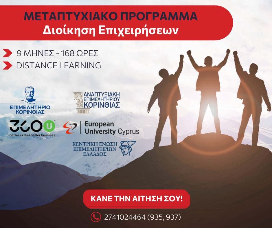 Το Επιμελητήριο Κορινθίας, η Αναπτυξιακή εταιρεία του και η 360U Better Skills – Better Business αναγνωρίζοντας την αυξανόμενη ανάγκη για εκπαίδευση, παρουσιάζουν υπό την αιγίδα της Κεντρικής Ένωσης Επιμελητηρίων Ελλάδος (ΚΕΕΕ) και σε συνεργασία με το Ευρωπαϊκό Πανεπιστήμιο Κύπρου, το Μεταπτυχιακό Πρόγραμμα στη Διοίκηση Επιχειρήσεων.