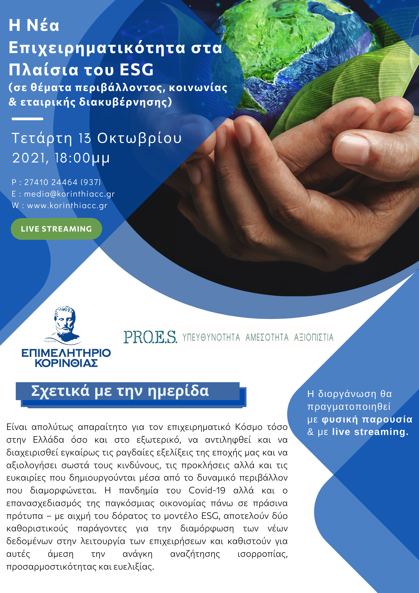 Το Επιμελητήριο Κορινθίας σε συνεργασία με την εταιρεία συμβούλων Επιχειρήσεων PROES, σας προσκαλεί στην ενημερωτική ημερίδα με θέμα «Η Νέα Επιχειρηματικότητα στα Πλαίσια του ESG».