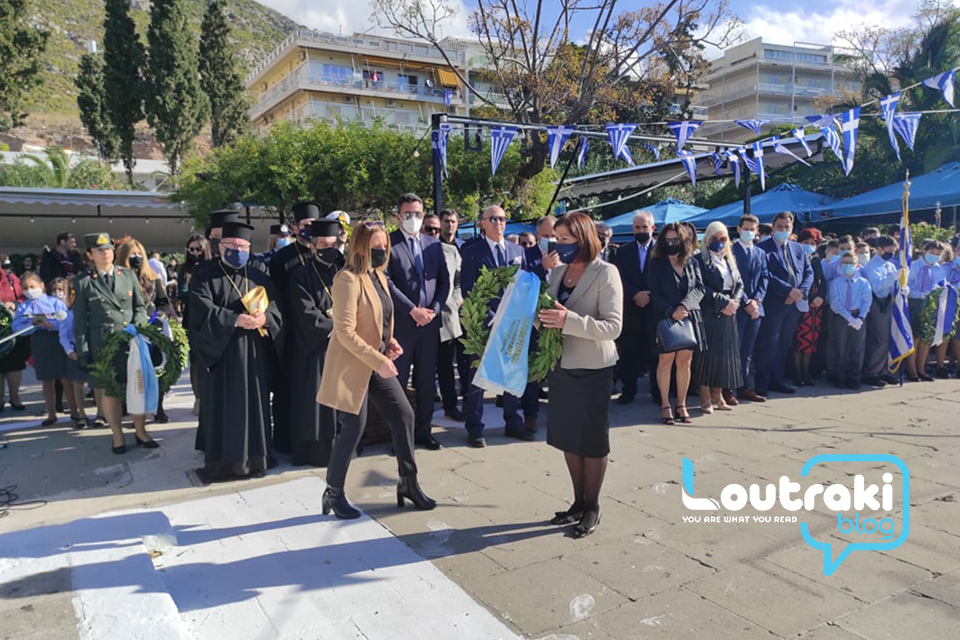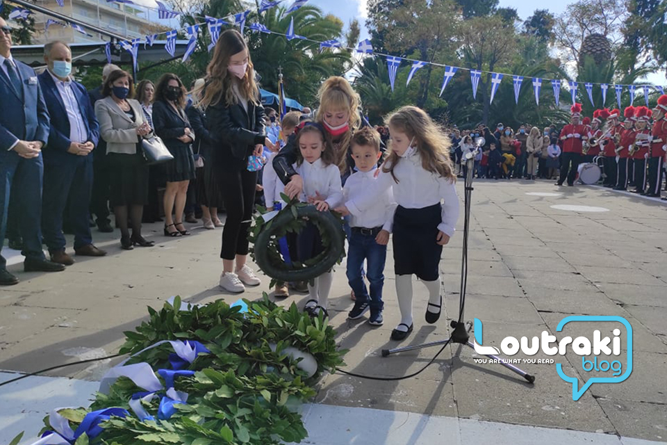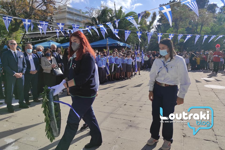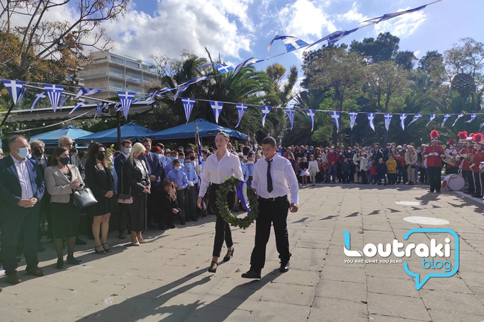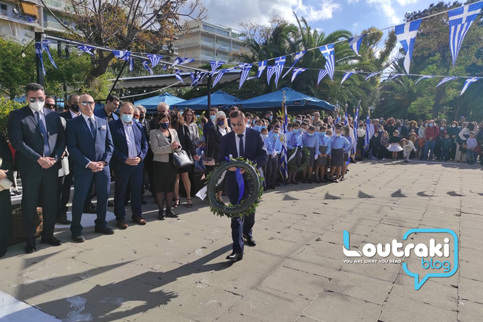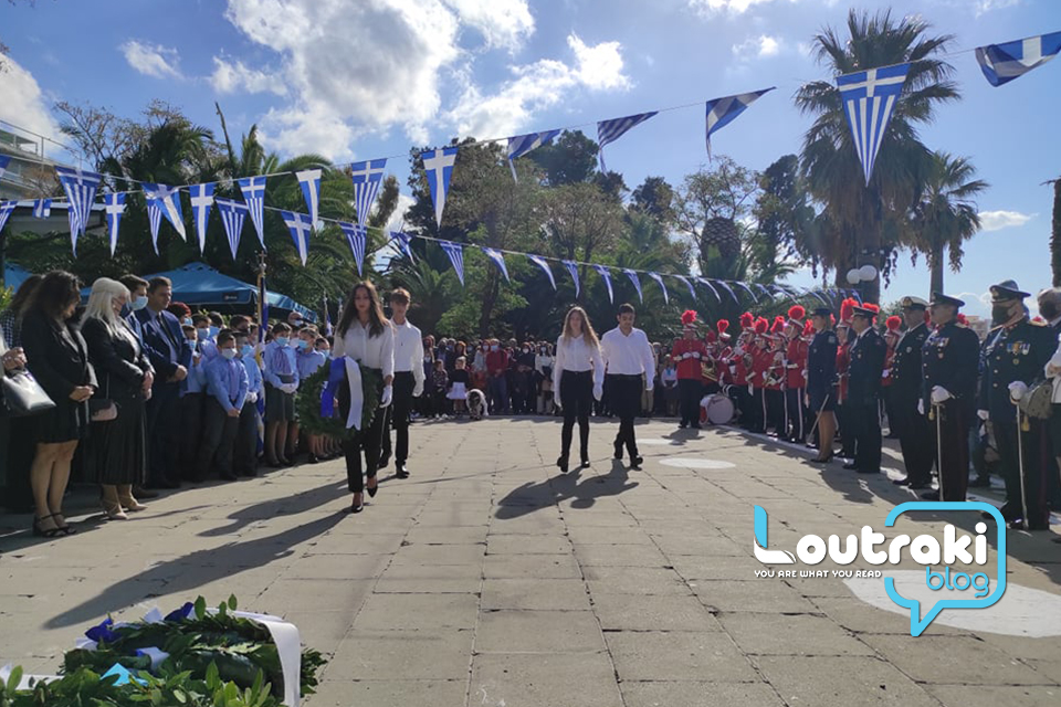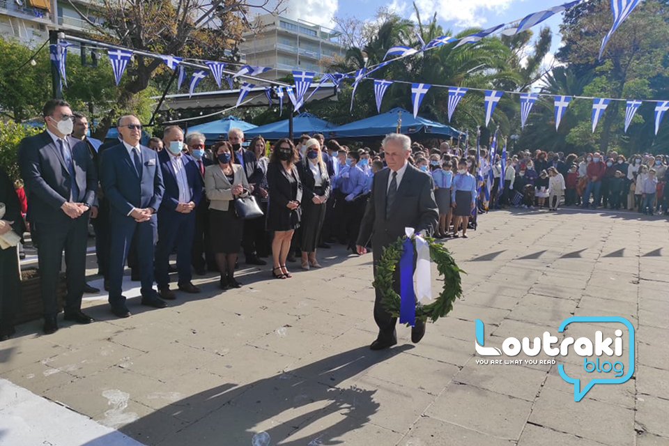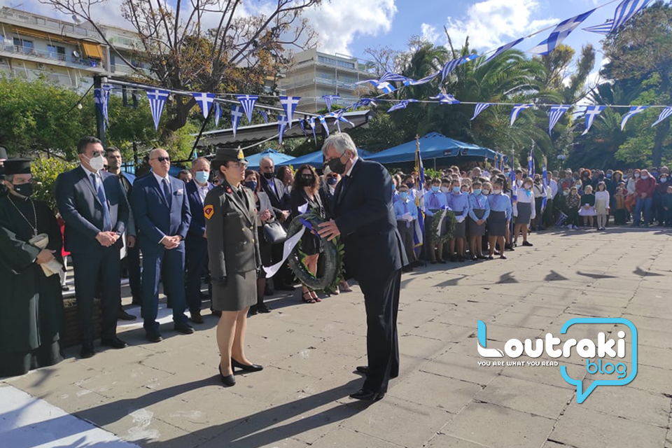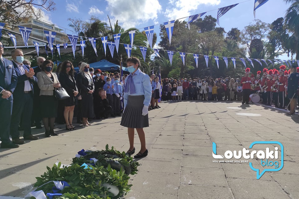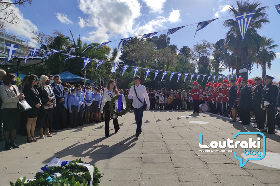 ‘Ετσι και στο Λουτράκι, πριν την έναρξη της παρέλασης, κατατέθηκαν στεφάνια στο Ηρώο των πεσόντων στο παραλιακό πάρκο Λουτρακίου, εκ μέρους της πολιτικής, πολιτειακής και στρατιωτικής ηγεσίας , παράλληλα έγινε η ανάκρουση του εθνικού ύμνου,ενώ κρατήθηκε ενός λεπτού σιγή στη μνήμη των ηρώων του 1940.