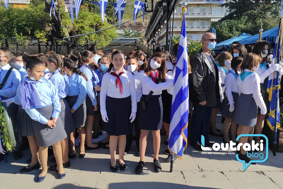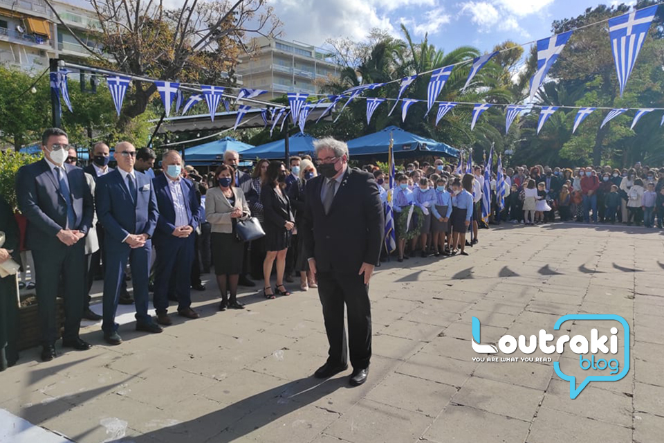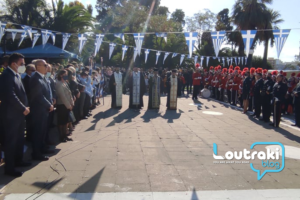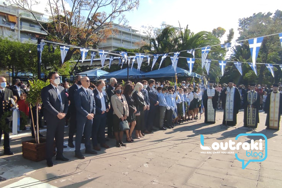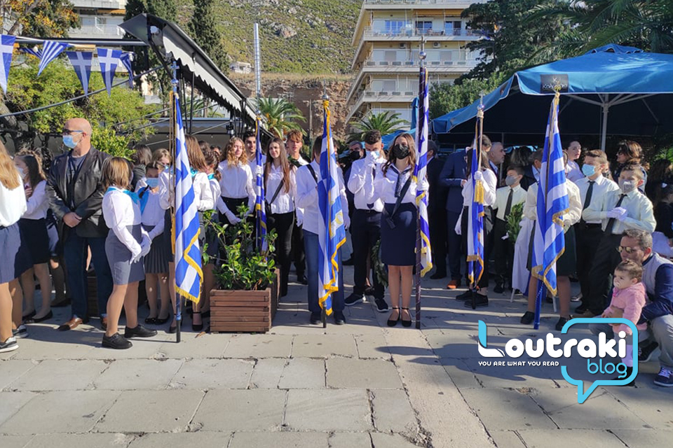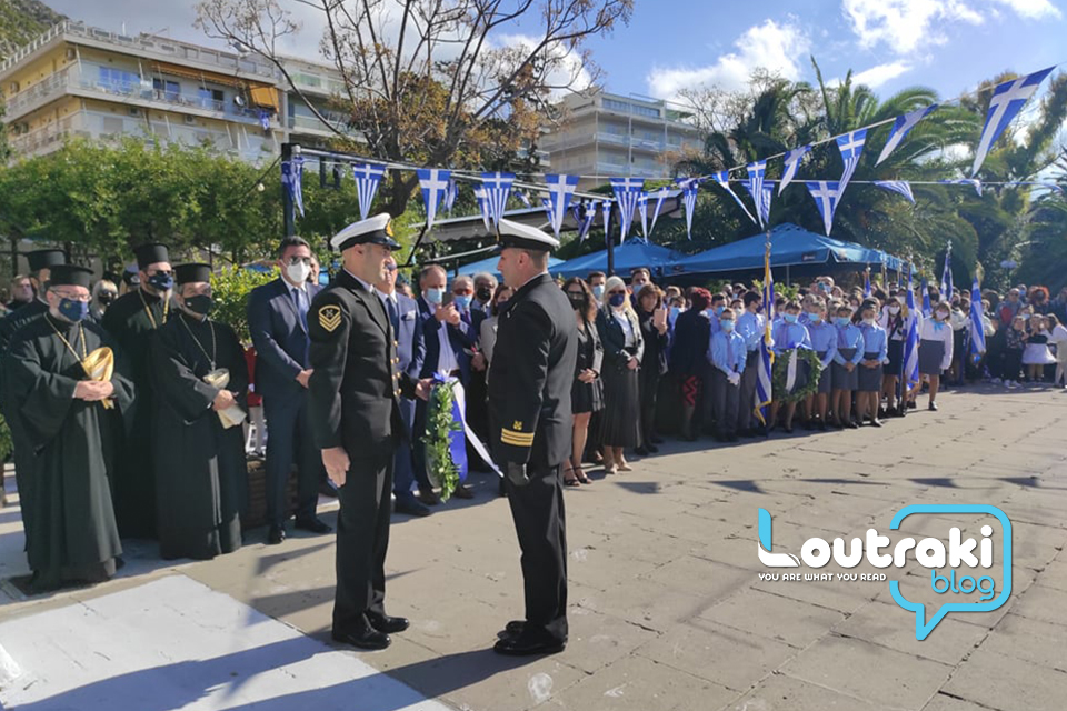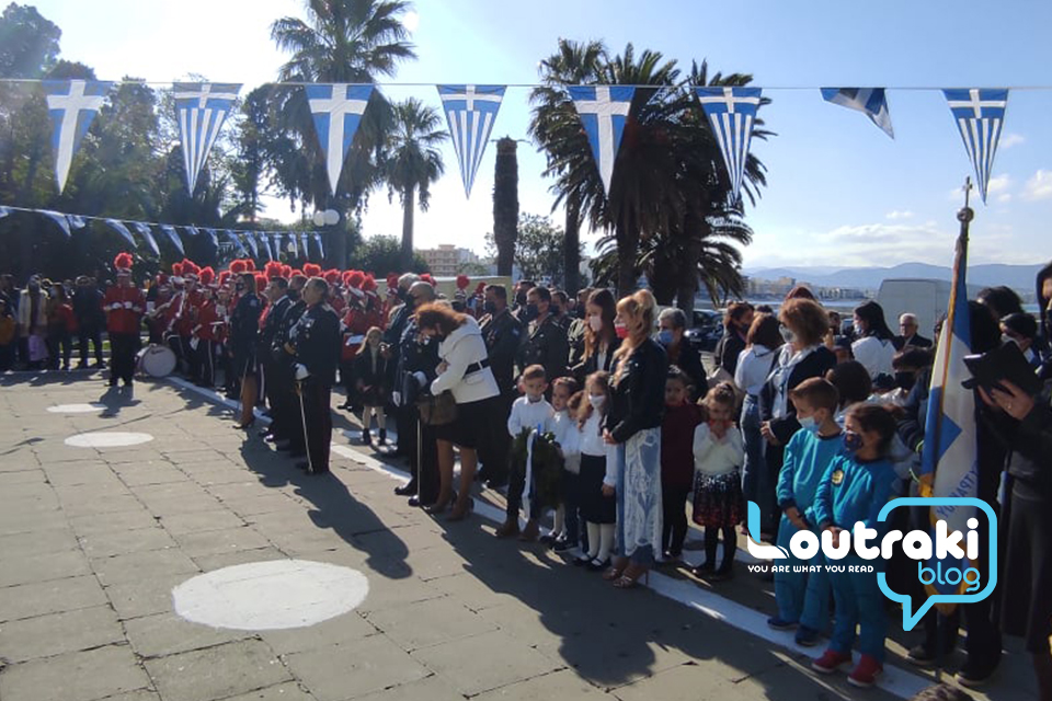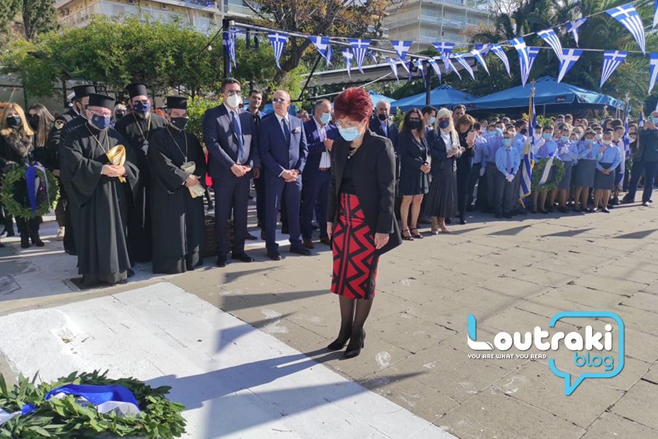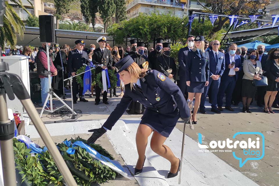 ‘Ετσι και στο Λουτράκι, πριν την έναρξη της παρέλασης, κατατέθηκαν στεφάνια στο Ηρώο των πεσόντων στο παραλιακό πάρκο Λουτρακίου, εκ μέρους της πολιτικής, πολιτειακής και στρατιωτικής ηγεσίας , παράλληλα έγινε η ανάκρουση του εθνικού ύμνου,ενώ κρατήθηκε ενός λεπτού σιγή στη μνήμη των ηρώων του 1940.