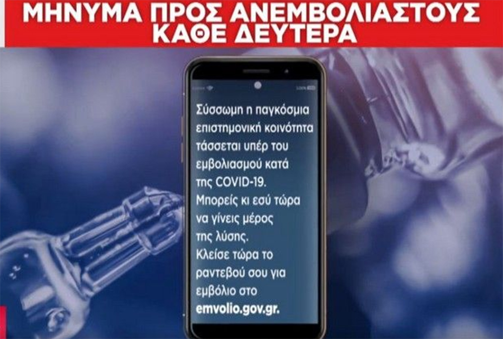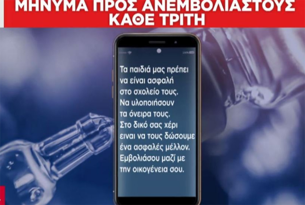 Μήνυμα προς ανεμβολίαστους κάθε Πέμπτη: «Περισσότεροι από 6,5 εκατομμύρια Έλληνες και Ελληνίδες εμπιστεύτηκαν την επιστήμη και έκαναν το εμβόλιο για την covid-19. Εσύ και η οικογένειά σου μπορείτε να νιώσετε περισσότερο ασφαλείς και σίγουροι. Πάρτε την ζωή στα χέρια σας κάνοντας το εμβόλιο ενάντια στην covid-19».