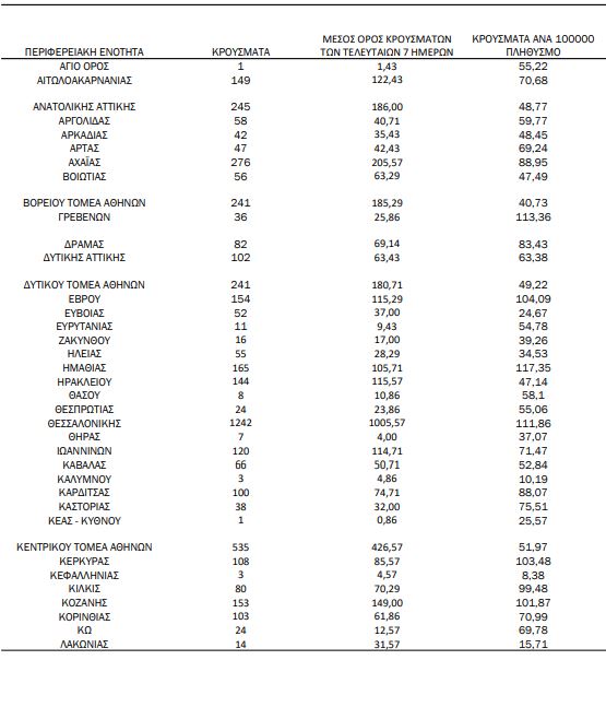Με βάση τα επιβεβαιωμένα κρούσματα των τελευταίων 7 ημερών, 103 θεωρούνται σχετιζόμενα με ταξίδι από το εξωτερικό και 2.879 είναι σχετιζόμενα με ήδη γνωστό κρούσμα.