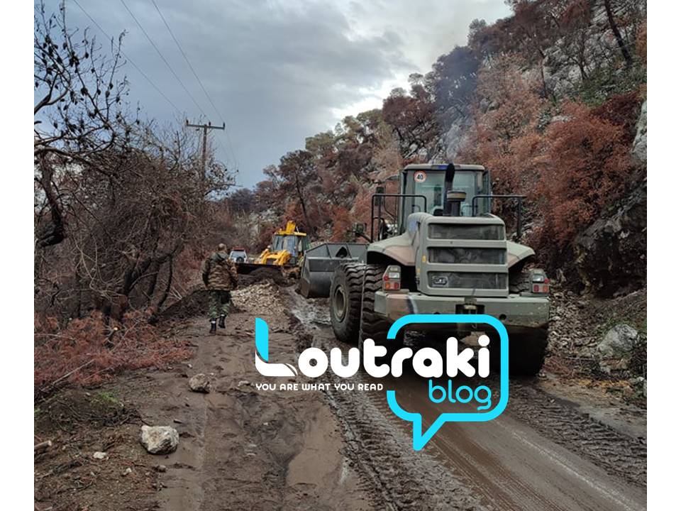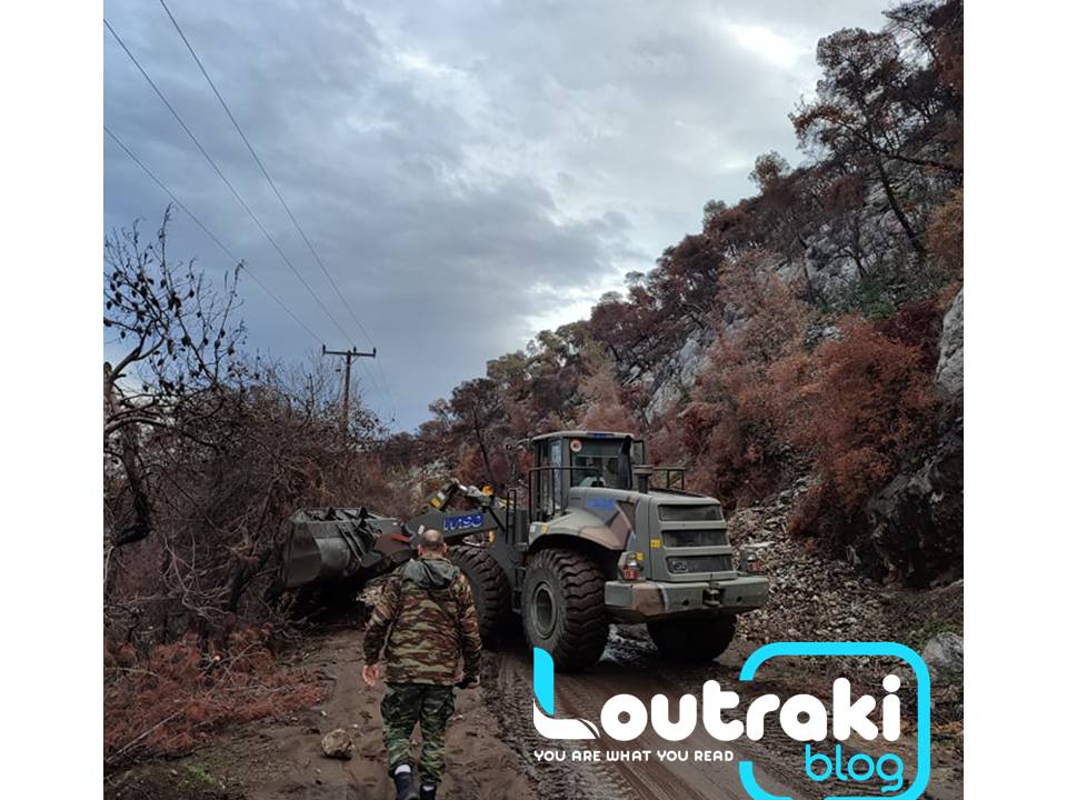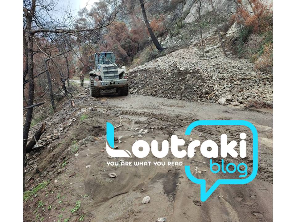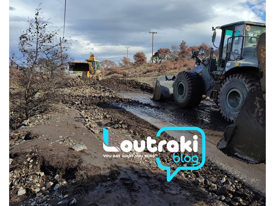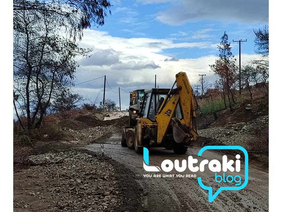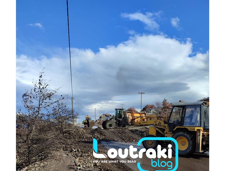 Μηχανήματα του δήμου και εξωτερικά συνεργεία ανέλαβαν τον καθαρισμό από χθές αλλά λόγω της σοβαρότητας της κατάστασης ο δήμαρχος Λουτρακίου, κ. Γιώργος Γκιώνης ζήτησε τη συνδρομή ενός βαρέως τύπου μηχανήματος του 747 Ετ Μηχανικού Λουτρακίου για τον καθαρισμό του δικτύου και τη διάνοιξή του.