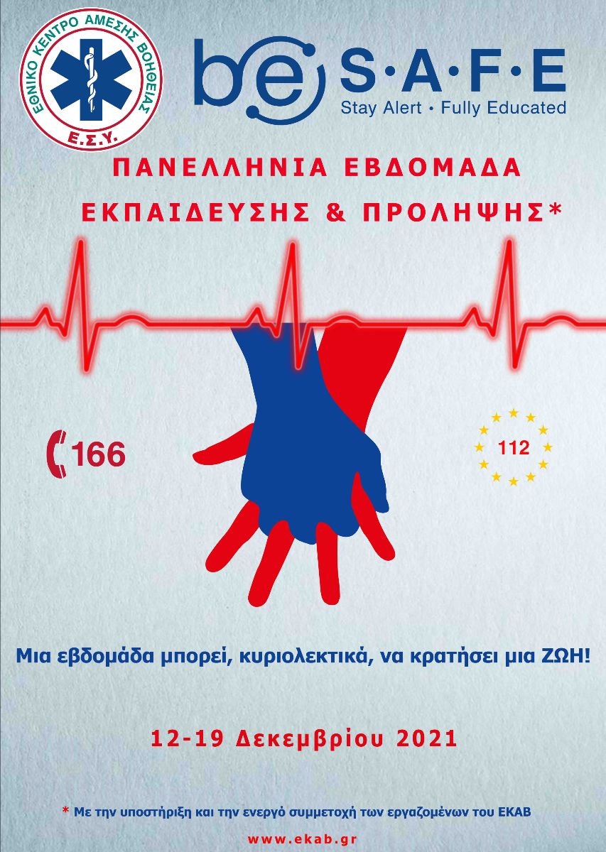 Το ΕΚΑΒ, ως επίσημος Δημόσιος φορέας παροχής επείγουσας προνοσοκομειακής φροντίδας, στα πλαίσια του Πανελλαδικού εκπαιδευτικού σχεδίου δράσης του διοργανώνει, για 8η χρονιά και συγκεκριμένα από τις 12 έως και τις 19 Δεκεμβρίου 2021, τη Πανελλήνια Εβδομάδα Εκπαίδευσης & Πρόληψης, με κεντρικό μήνυμα: «ΕΚΑΒ be S.A.F.E.- Μια εβδομάδα μπορεί, κυριολεκτικά, να κρατήσει μια ΖΩΗ!».