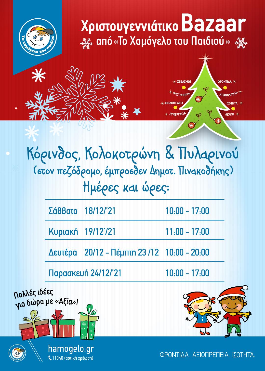 «Το Χαμόγελο του Παιδιού» προσκαλεί τους φίλους και υποστηρικτές του να επισκεφτούν τα Χριστουγεννιάτικα Βazaars, που διοργανώνει σε πολλές περιοχές της Ελλάδας, σε μια προσπάθεια να χαρίσει σε κάθε παιδί σε ανάγκη το πολυτιμότερο δώρο, το Χαμόγελό του.