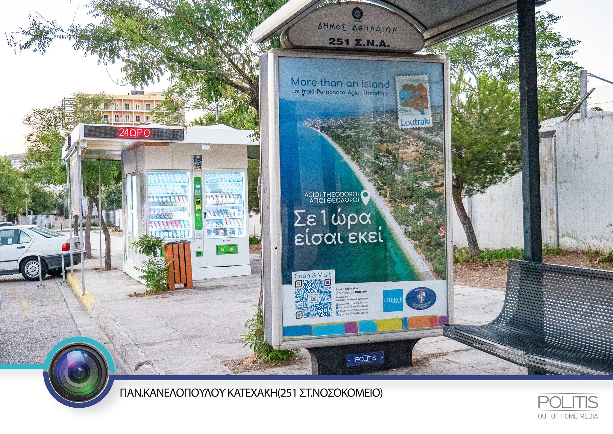 Με εκτεταμένη καμπάνια προβολής στον Δήμο Αθηναίων σε επιλεγμένα bus shelters σε κεντρικά σημεία όπου μετακινούνται καθημερινά εκατομμύρια επιβάτες όπως το Σύνταγμα, η Πανεπιστημίου, η Λεωφόρος Συγγρού και άλλα παρεμφερή σημεία στην Αθήνα. Σε αυτά τα σημεία τοποθετήσαμε διαφημιστικά panels με απεικόνιση παραλιών και τοπίων ιδιαίτερου κάλλους του Δήμου Λουτρακίου, Περαχώρας, Αγίων Θεοδώρων με το μήνυμα “Σε 1 ώρα είσαι εκεί” – γνωστοποιώντας ή απλά υπενθυμίζοντας στον Αθηναίο που περιμένει το λεωφορείο στη στάση ή σε αυτόν που περνάει με το αυτοκίνητό του ότι οι φυσικές ομορφιές του Δήμου μας που θυμίζουν νησί, βρίσκονται μόλις σε 1 ώρα απόσταση από την Αθήνα. Η καμπάνια είχε διάρκεια 15 ημέρες στην διάρκεια των οποίων τα banners μας έγιναν ορατά από εκατομμύρια Αθηναίους & τουρίστες!