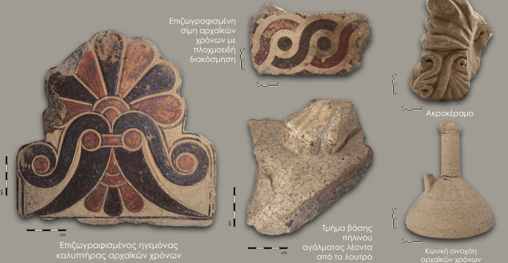 Εν συνεχεία, βόρεια των θερμών δωματίων ανασκάφηκε το τρίτο praefurnium των λουτρών και οι χώροι που εξυπηρετούσαν στην αποθήκευση υλικών-ξυλείας για τη λειτουργεία του. Εντός των τομών αυτών, μεταξύ άλλων ευρημάτων των ρωμαϊκών χρόνων, βρέθηκαν καταπεσμένα αρχιτεκτονικά μέλη αρχαϊκής περιόδου, ένας ηγεμόνας καλυπτήρας και μια επιζωγραφισμένη σίμη με πλοχμοειδή διακόσμηση (Εικ.2), στοιχεία που πιθανώς προέρχονται από κτίριο ίδιας χρονολογικής με αυτά περιόδου, το οποίο πιθανολογείται ότι βρίσκεται στην εγγύτητα του μνημείου και του οποίου έχουν εντοπιστεί σε προγενέστερες ανασκαφικές περιόδους σημαντικά αρχιτεκτονικά μέλη.