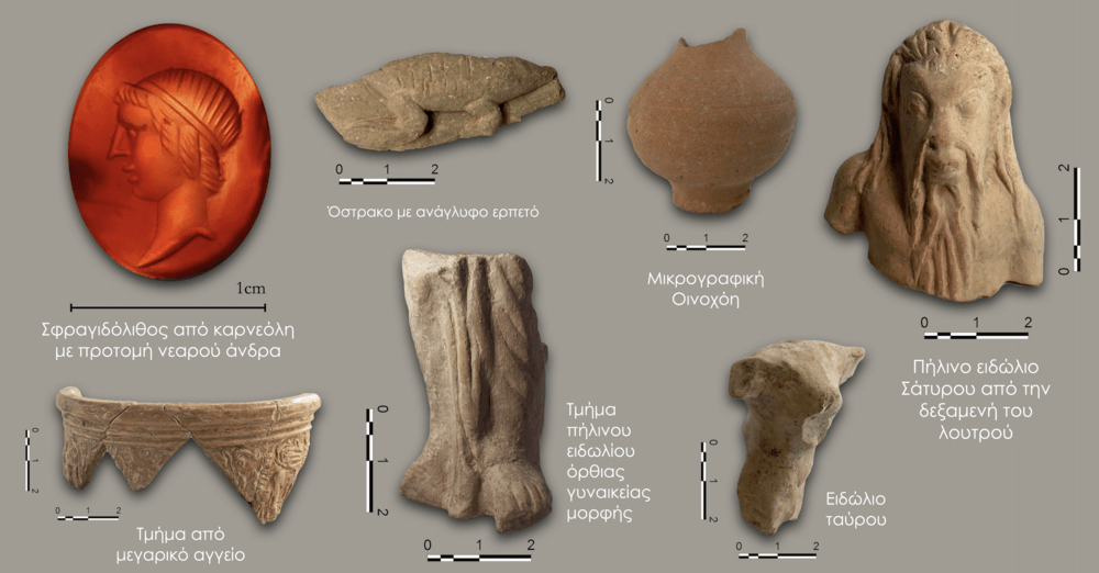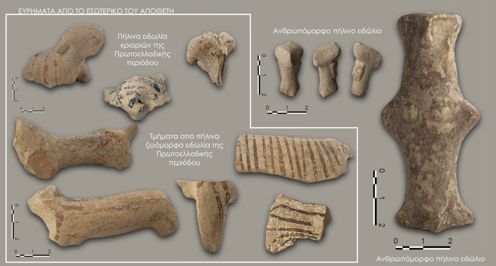 Τα ευρήματα από το στρώμα επικάλυψης αλλά και το εσωτερικό του αποθέτη είναι ιδιαίτερα σημαντικά. Από αυτά ξεχωρίζουν ειδώλια κριαριών, βάσεις αποθηκευτικών αγγείων με αποτύπωμα ψάθας και μία βάση με αποτύπωμα φύλλων, τμήματα από πήλινες εστίες με εγχάρακτη διακόσμηση, τμήματα πιθανόν από φορητές πήλινες τράπεζες προσφορών με σπειροειδή και εγχάρακτη διακόσμηση, πόδια τριποδικών αγγείων και κρατευτών, πρόχοι, πολυάριθμα θραύσματα ανοιχτών αγγείων, φιάλες με μαύρο και ερυθρό επίχρισμα, φιάλες με πόδι και φιάλες με δακτυλιόσχημη ή επίπεδη βάση, κομβιόσχημες λαβές από πίθους, καθώς και σωληνωτές από μεγάλα ανοιχτά αγγεία. Λαβές με έκκρουστη και εγχάρακτη διακόσμηση και τμήματα πίθων με ανάγλυφη σχοινοειδή διακόσμηση. Επιπλέον, ήλθαν στο φως τμήματα από κύμβες (σαλτσιέρες), αρύταινες, πινάκια και τμήμα λίθινου σκεύους. Σημαντικός είναι και ο εντοπισμός μεγάλης ποσότητας σφονδυλιών, καθώς και πυρήνων, λεπίδων και απολεπισμάτων από οψιανό, καθώς και λειασμένων εργαλείων.