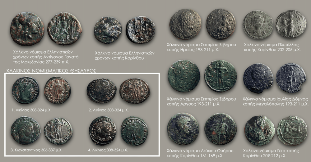 Στο εσωτερικό τους βρέθηκαν αντικείμενα εμπορικής δραστηριότητας, (κεραμική ρωμαϊκής περιόδου χρηστικών αγγείων, γυάλινα και κεραμικά αγγεία κοσμετολογίας, περόνες, λύχνοι κ.α.)(Εικ.3), λάκκοι αποθήκευσης προϊόντων και 179 νομίσματα που χρονολογούνται από τα τέλη του 2ου αι. μ.Χ. μέχρι τα μέσα του 6ου αι. μ.Χ. (Εικ. 5) Η συνέχεια της ανασκαφής στο δωμάτιο, όπου εντοπίστηκαν το 2020 ο θησαυρός των 30 χρυσών νομισμάτων των αυτοκρατόρων Μαρκιανού, Ιουστίνου Α΄ και Ιουστινιανού, απέδωσε πάνω από 120 νέα νομίσματα, ανεβάζοντας τον συνολικό αριθμό νομισμάτων σε 202, γεγονός που υποδηλώνει την έντονη οικονομική δραστηριότητα που συντελούνταν στο συγκεκριμένο χώρο. Στο ίδιο δωμάτιο, σε χαμηλότερο βάθος αποκαλύφθηκε πρωιμότερο κτίριο των ύστερων ελληνιστικών χρόνων, με κατεύθυνση Β/Ν. Το κτίριο φαίνεται να επεκτείνεται και πέραν των ορίων του ανεσκαμμένου χώρου και θα ερευνηθεί περαιτέρω την επόμενη ανασκαφική περίοδο. Επιπλέον, ανασκάφηκαν δύο νέα κτίρια πιο βόρεια και πιο νότια των ανωτέρω χώρων εμπορικής δραστηριότητας, παρόμοιας με αυτά τυπολογίας και στον ίδιο με αυτά άξονα, υποδηλώνοντας την επέκταση της πόλης και προς τις δύο κατευθύνσεις. Στα ευρήματα των συγκεκριμένων χώρων ξεχωρίζει ένας σφραγιδόλιθος από καρνεόλη όπου εικονίζεται προτομή νεαρού άνδρα.