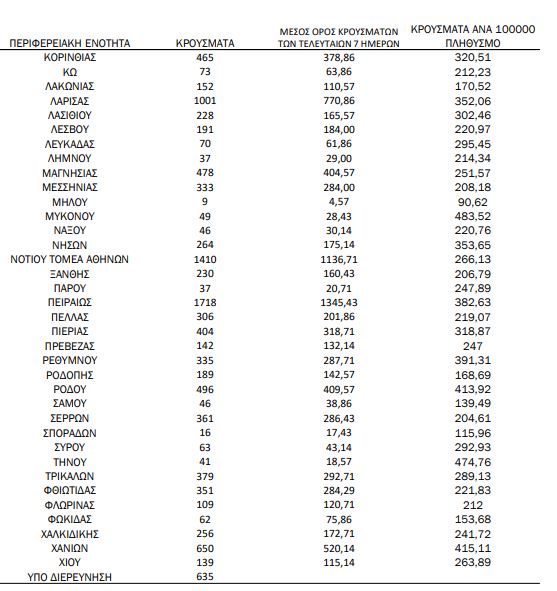Με βάση τα επιβεβαιωμένα κρούσματα των τελευταίων 7 ημερών, 624 θεωρούνται σχετιζόμενα με ταξίδι από το εξωτερικό και 1.952 είναι σχετιζόμενα με ήδη γνωστό κρούσμα.
