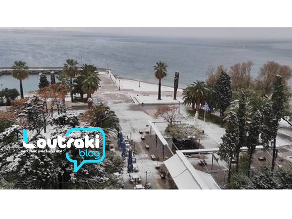 Στο Λουτράκι, καλύφθηκε η παραλία από χιόνι..