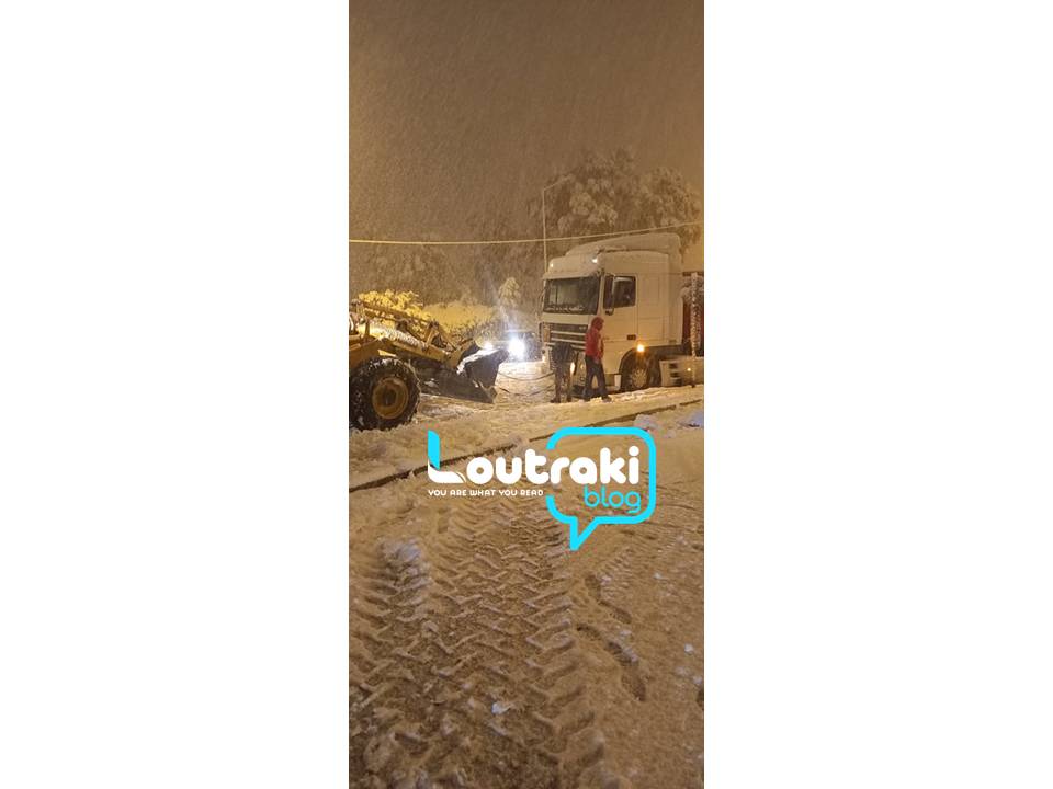 Ενα μεγάλο όχημα επίσης, συγκεκριμένα βυτιοφόρο, κόλλησε, με αποτελέσμα να χρειαστεί μπουλντόζα του δήμου Λουτρακίου για να το τραβήξει.