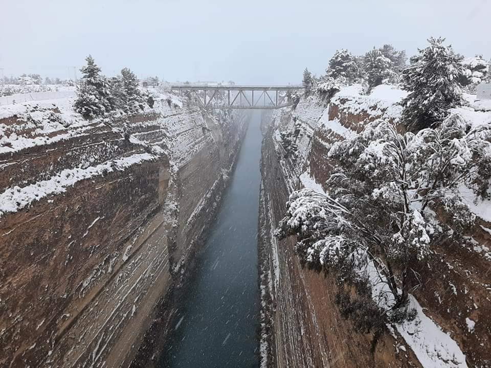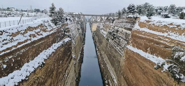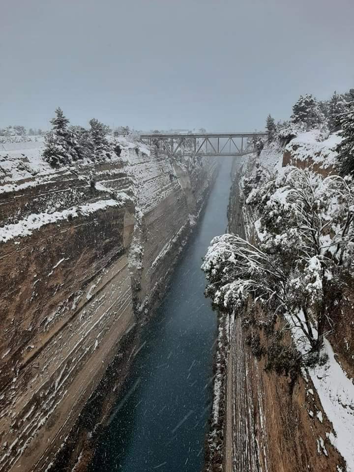 Πανέμορφη και χιονισμένη είναι και η Διώρυγα στον Ισθμό της Κορίνθου. Ντυμένη στα λευκά, μαγνητίζει τα βλέμματα ..