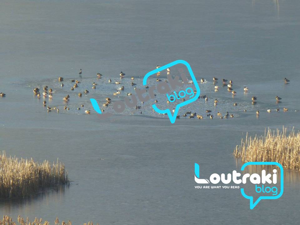 Παρατηρήστε καλά η λίμνη είναι όλη παγωμένη εκτός από το σημείο που είναι οι πάπιες..! Μερικές από τις πάπιες κάθονται επάνω στον πάγο..!!!
