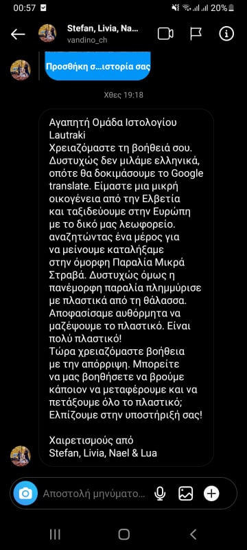 Σήμερα πρωί πρωί, ανέλαβαν δράση και καθάρισαν την όμορφη παραλία! Αφού τους ευχαριστήσαμε εκ μέρους όλων των δημοτών για το σπουδαίο έργο τους και την αγάπη τους για το περιβάλλον μας έστειλαν το ακόλουθο μήνυμα
