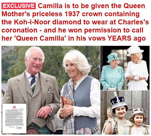Αίσθηση μάλιστα προκαλεί και η σημερινή αποκάλυψη της Daily Mail ότι η βασίλισσα παραχωρεί στην Καμίλα το στέμμα της βασιλομήτωρος με το ανεκτίμητης αξίας διαμάντι Koh-i-Noor.