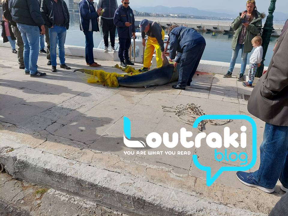 Το έσυρε με τη βάρκα του μέχρι το λιμάνι του Λουτρακίου, όπου έσπευσε αμέσως το Λιμενικό, ενώ με τη βοήθεια γερανού έβγαλαν το ψάρι στη στεριά.