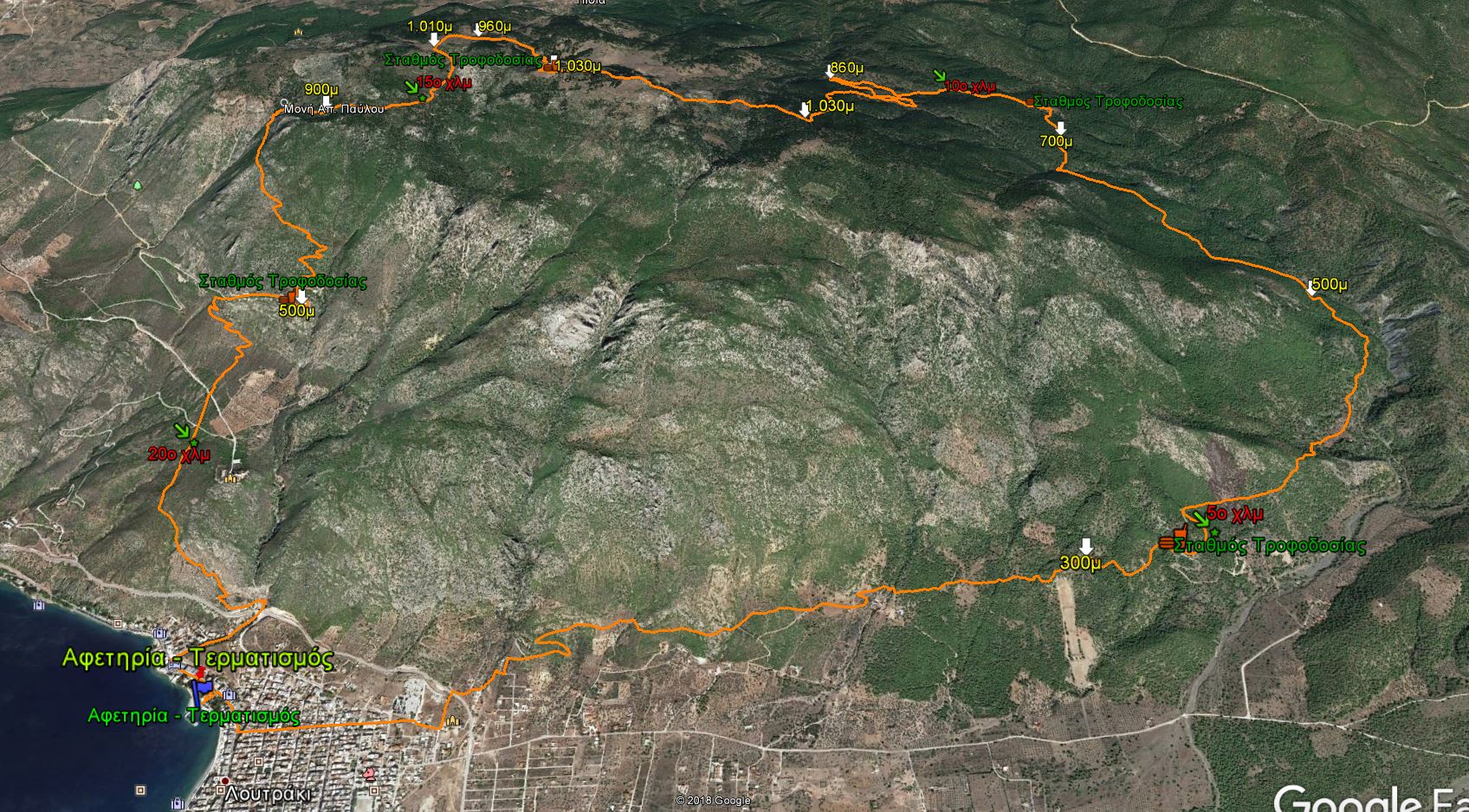 Ακολουθώντας τα μονοπάτια των βοσκών και των ρετσινάδων,  κινείται μέσα σε δάσος πεύκων για να βγει στην κορυφογραμμή για να διασχίσει το δάσος ελάτης, πάνω από τον ορεινό όγκο των Γερανείων. Από εδώ ακολουθεί  κατηφορική πορεία για να περάσει από τα μοναστήρια του Απ. Παύλου και Οσίου Παταπίου και να μπει στο παλιό μονοπάτι που χρησιμοποιούσαν παλιά για επικοινωνία με το μοναστήρι.