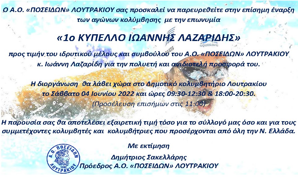Οι αγώνες θα διεξαχθούν το Σάββατο 4 Ιουνίου 2022 στις εγκαταστάσεις του Ανοικτού Δημοτικού Κολυμβητηρίου Λουτρακίου, περιλαμβάνονται στο πρόγραμμα της Κ.Ο.Ε. και στηρίζονται από τον Δήμο Λουτρακίου – Περαχώρας – Αγίων Θεοδώρων