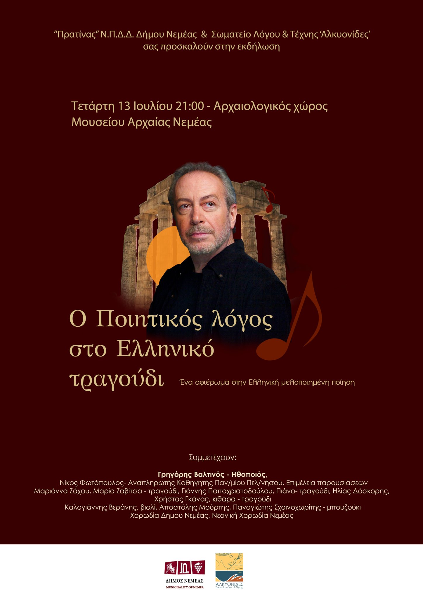 Τετάρτη 13 Ιουλίου στις 21.00, στον αρχαιολογικό χώρο του Μουσείου της Αρχαίας Νεμέας θα πραγματοποιηθεί πολιτιστική εκδήλωση – αφιέρωμα στην ελληνική μελοποιημένη ποίηση.